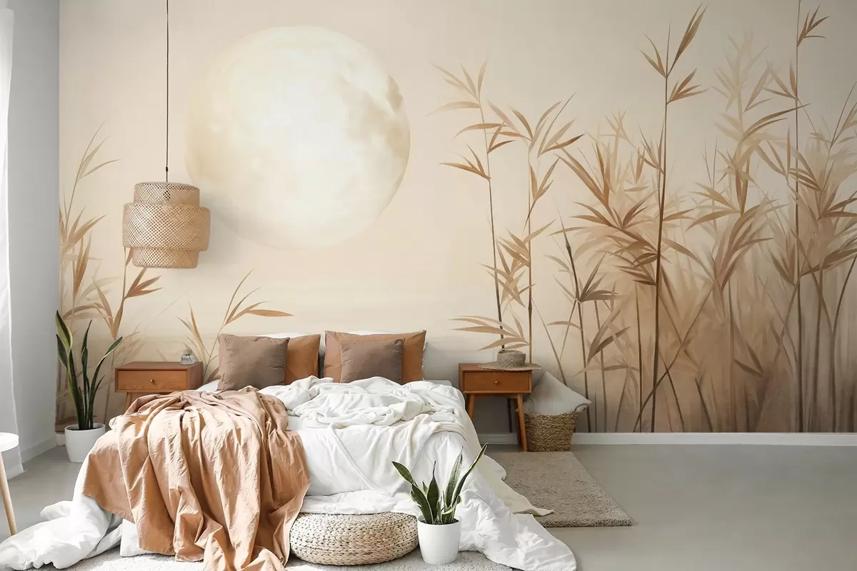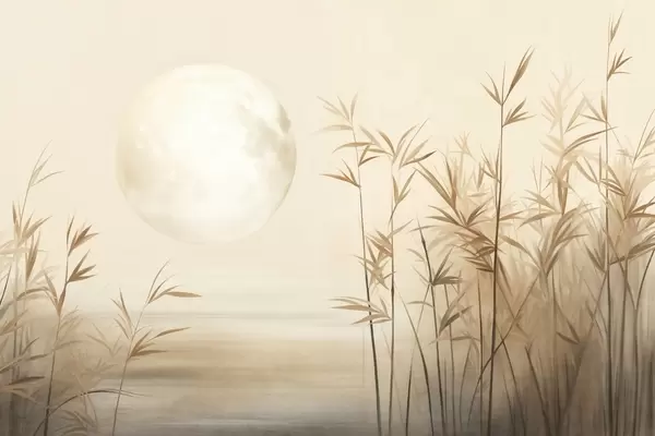 Fototapeter Teksturert landskap med høye siv, innsjø og blek måne i en disig himmel Nr. w09631