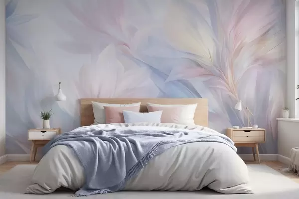 Fototapeter Myke, pastellfargede blader og fjær i nyanser av rosa, blått og gult, abstrakt og strukturert trykk Nr. w09634