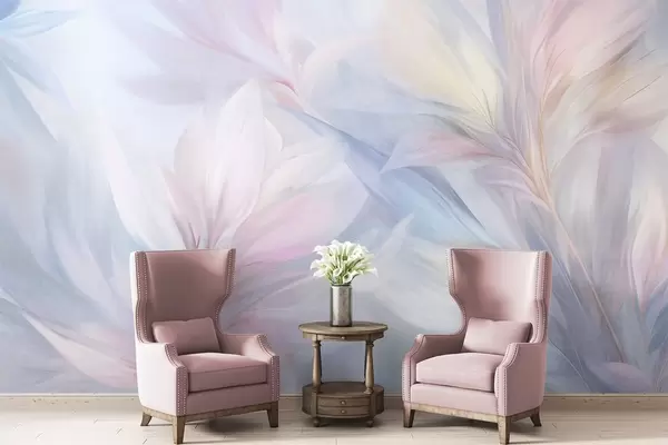 Fototapeter Myke, pastellfargede blader og fjær i nyanser av rosa, blått og gult, abstrakt og strukturert trykk Nr. w09634