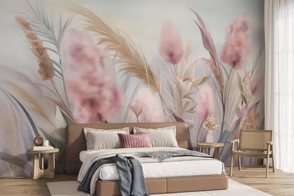 Fototapeter Rosa og beige pampasgress og andre tørkede blomster med en myk, disig himmel i bakgrunnen Nr. w09635