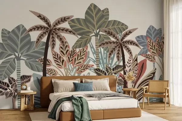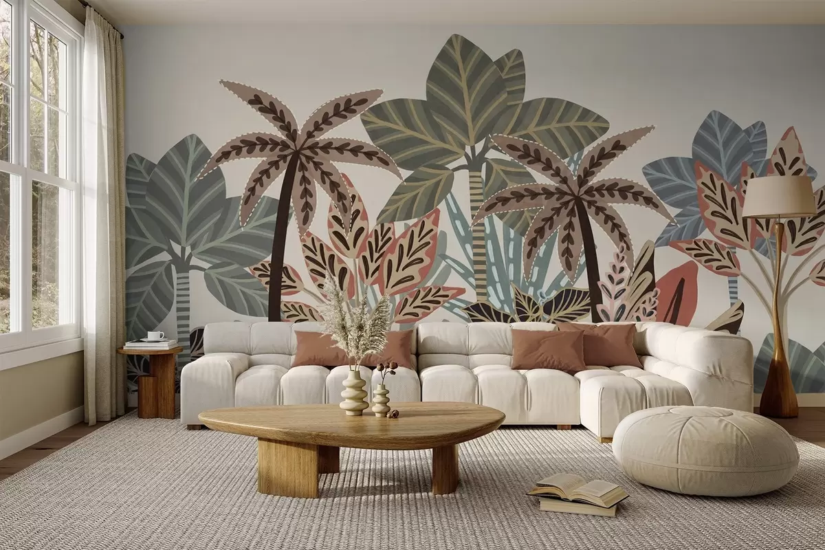 Fototapeter Teksturerte tropiske planter og palmer i dempede farger i dekorativ boho-stil mot en kremfarget bakgrunn Nr. w09639