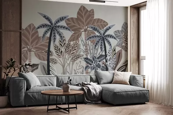 Fototapeter Teksturerte tropiske planter og palmer med dempede farger i dekorativ boho-stil mot en grå bakgrunn Nr. w09639v1