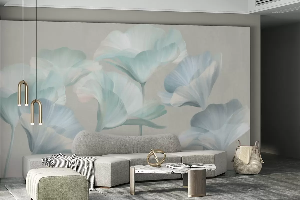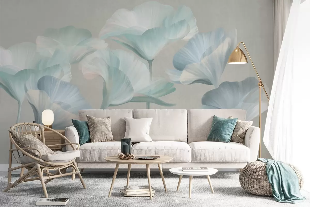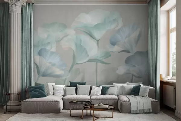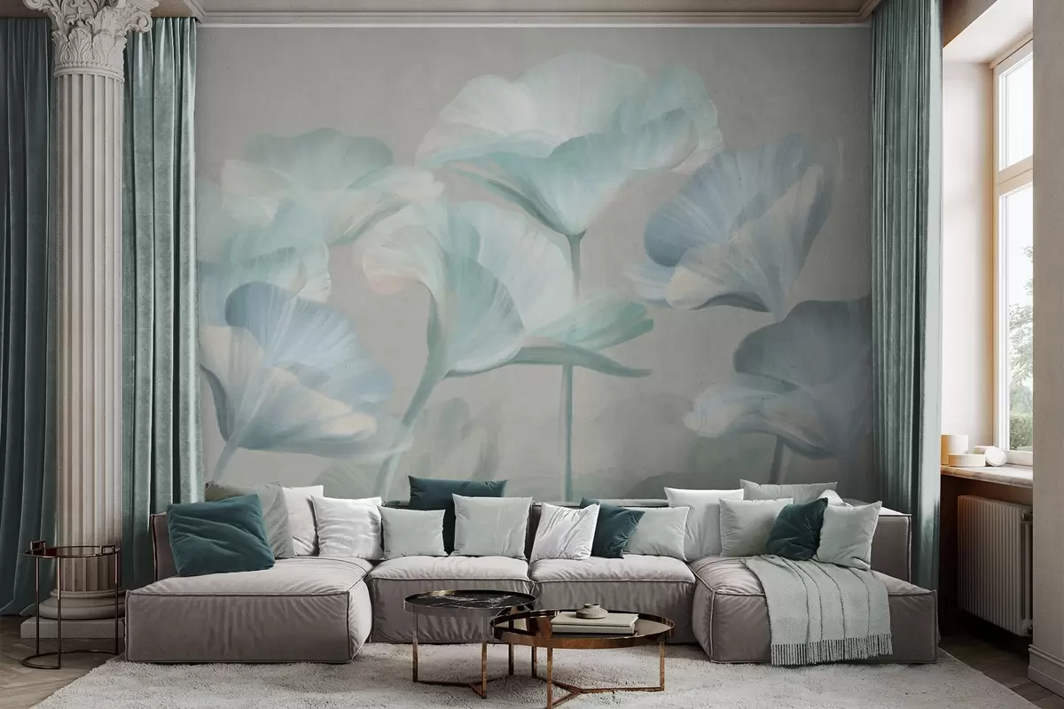 Fototapeter Blek turkis teksturerte gjennomsiktige lotusblomster med delikate kronblader mot en dempet grå bakgrunn Nr. w09640v2