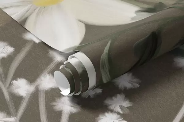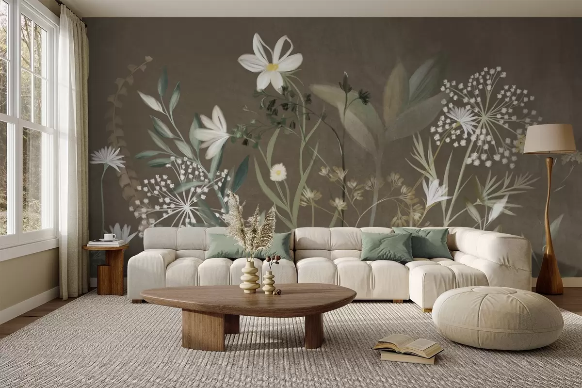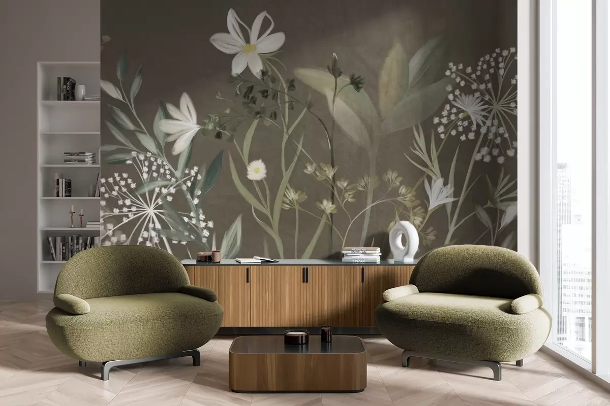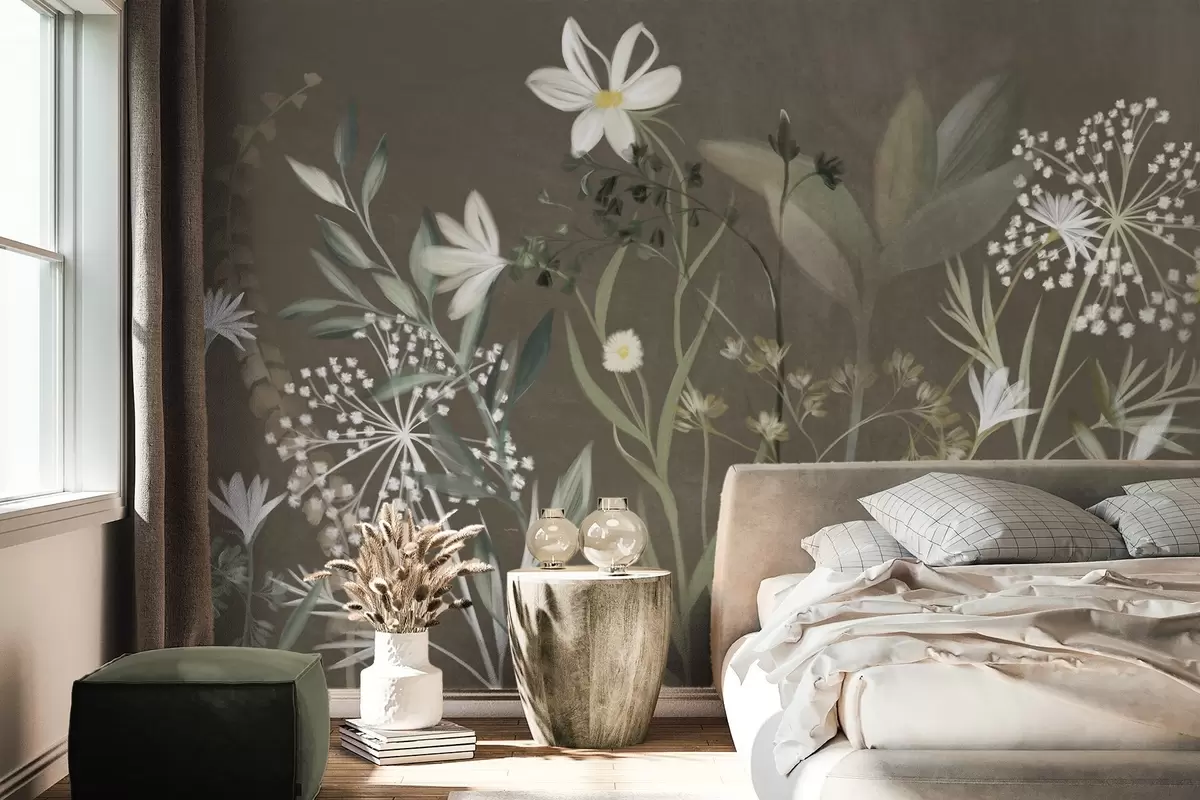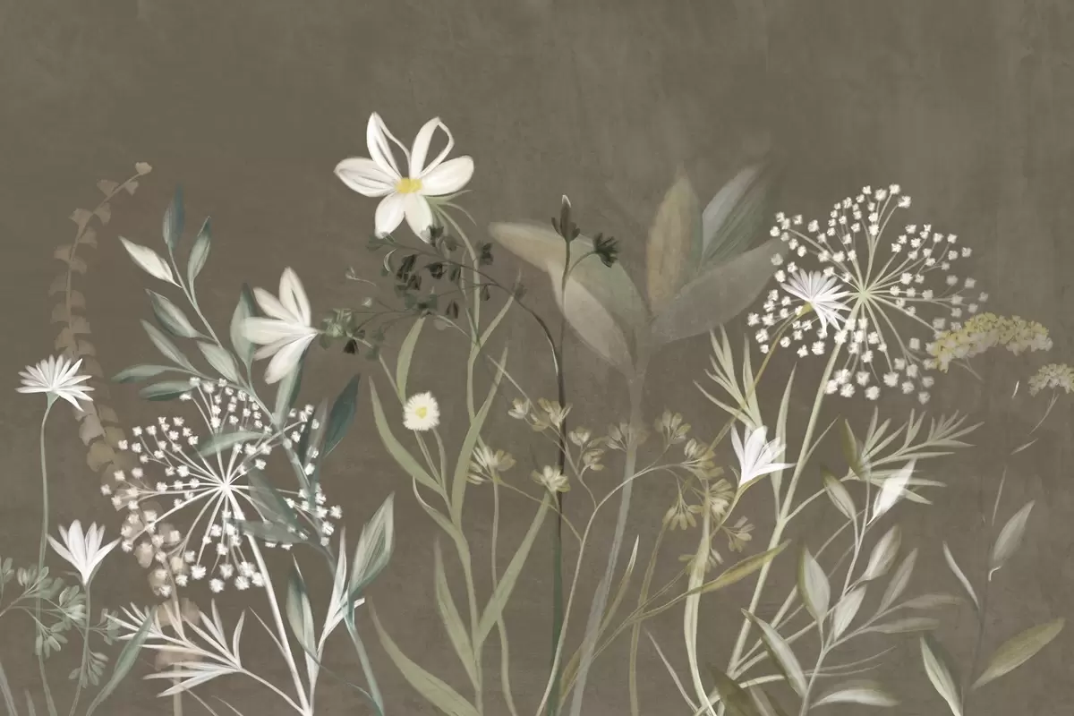 Fototapeter Delikate teksturerte villblomster og løvverk i dempede grønn- og kremfarger mot en brun bakgrunn Nr. w09641v1