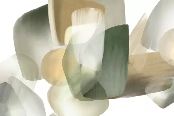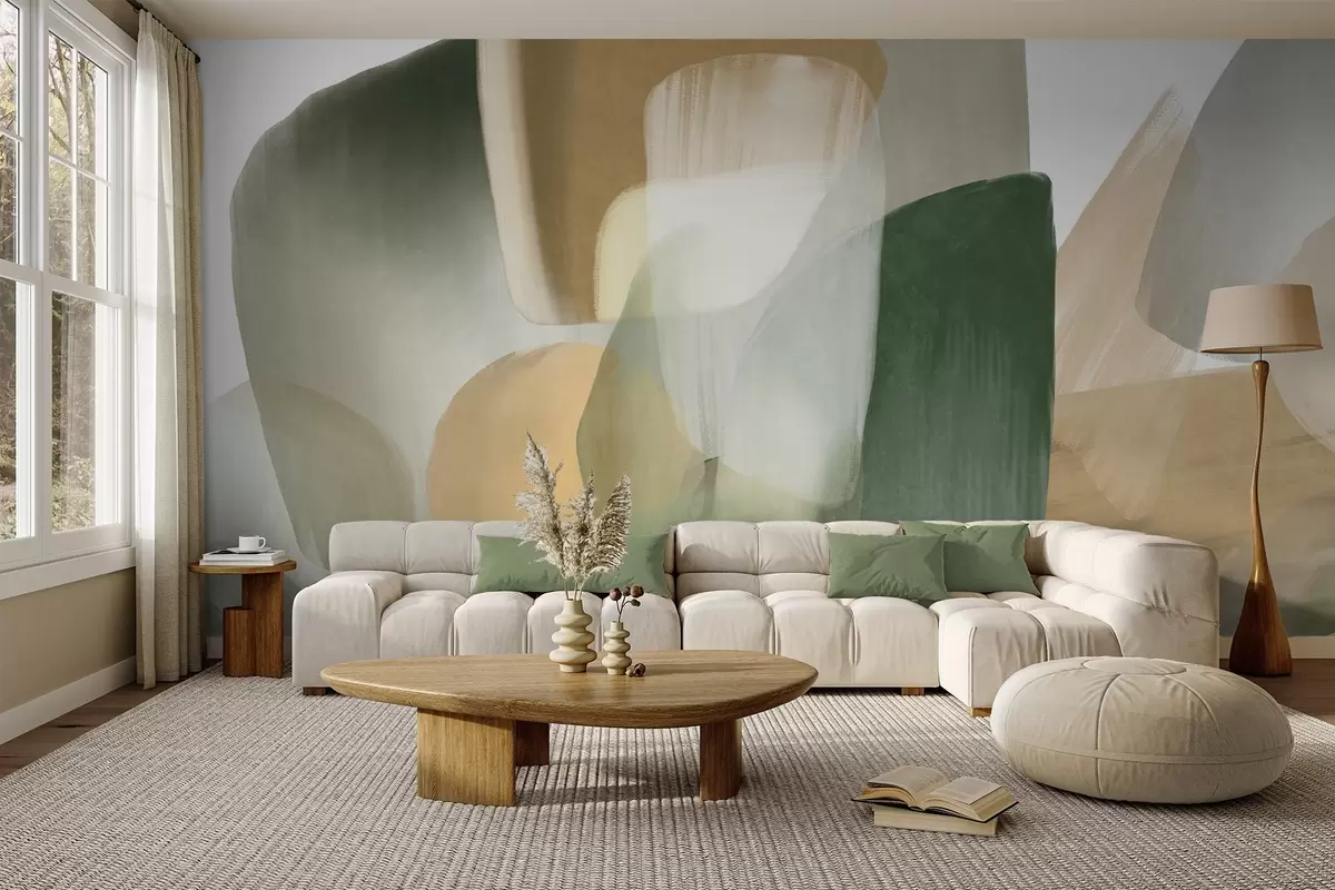 Fototapeter Abstrakte former med struktur i dempede grønn- og beigefarger, med myke kanter og overlappende lag. Nr. w09642