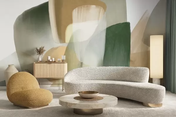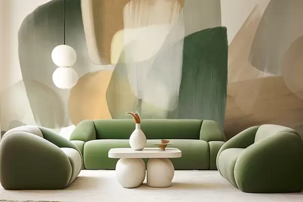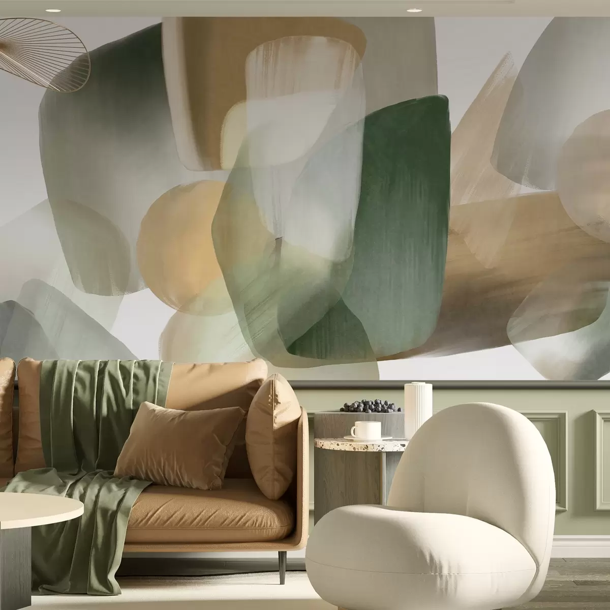 Fototapeter Abstrakte former med struktur i dempede grønn- og beigefarger, med myke kanter og overlappende lag. Nr. w09642