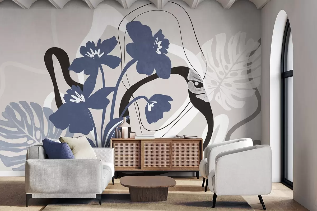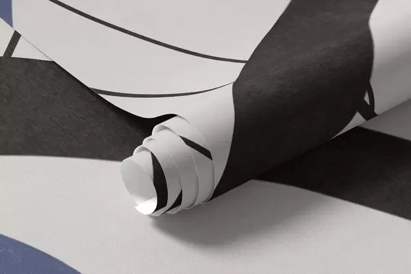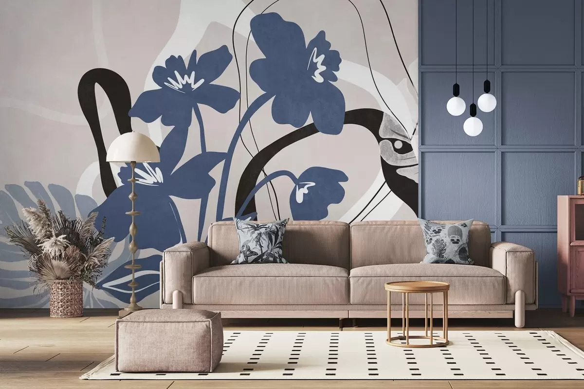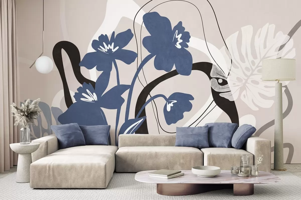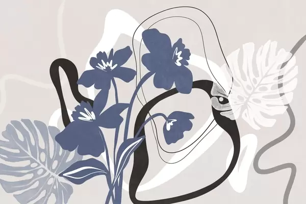 Fototapeter Abstrakte blå blomster med hvite og svarte former mot en lys beige bakgrunn, minimalistisk kunst Nr. w09645