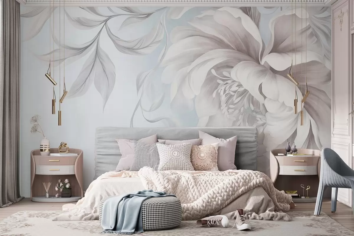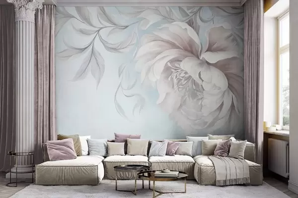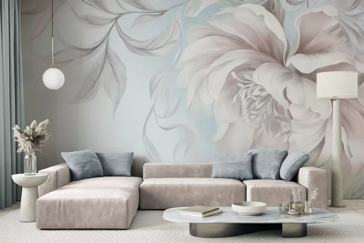 Fototapeter Stor, strukturert pion med delikate kronblader og grå blader, malt i en myk stil Nr. w09647v1