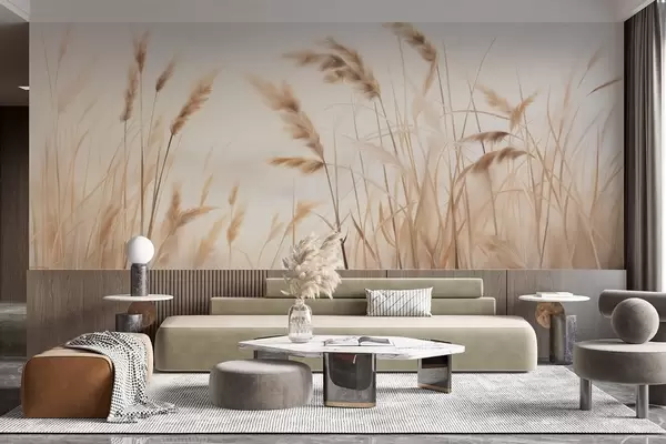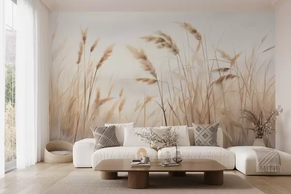 Fototapeter Høyt, strukturert tørt gress med hvetekorn på åkeren mot en myk, blek bakgrunn Nr. w09648