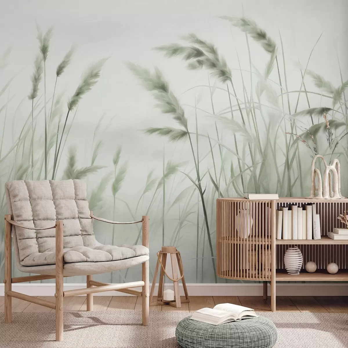 Fototapeter Høyt, strukturert tørt gress med hvetekorn på åkeren mot en myk, blek bakgrunn Nr. w09648v1