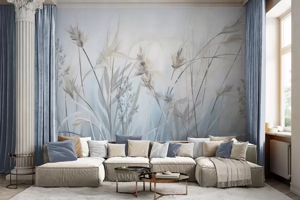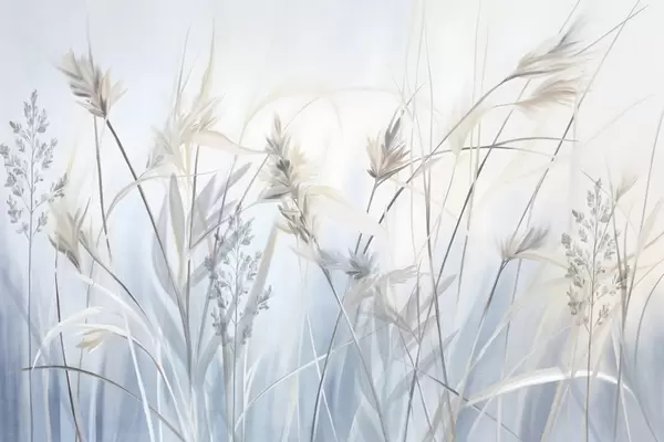 Fototapeter Høye, tørre gressstengler med fjærlignende topper i dempede farger, myk, disig blå og hvit bakgrunn Nr. w09652