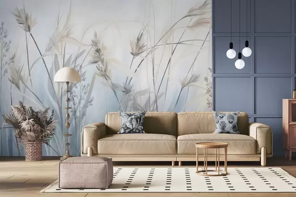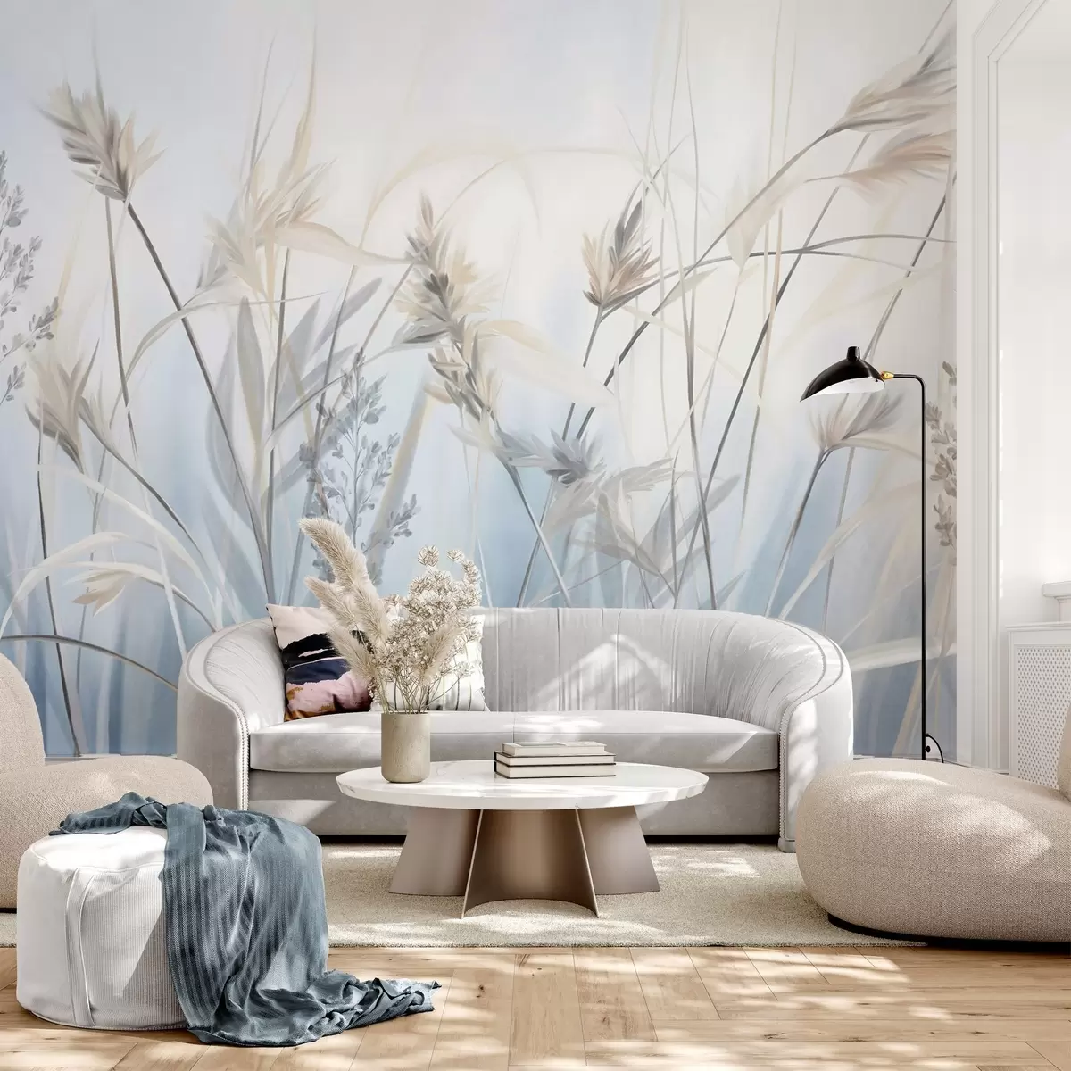 Fototapeter Høye, tørre gressstengler med fjærlignende topper i dempede farger, myk, disig blå og hvit bakgrunn Nr. w09652
