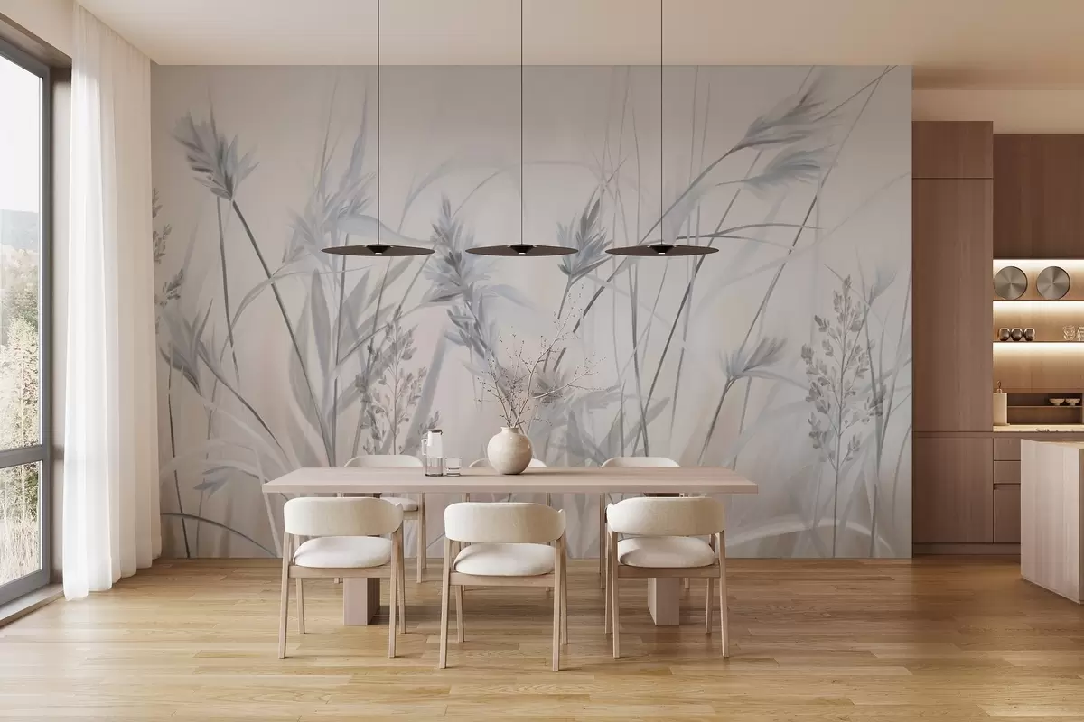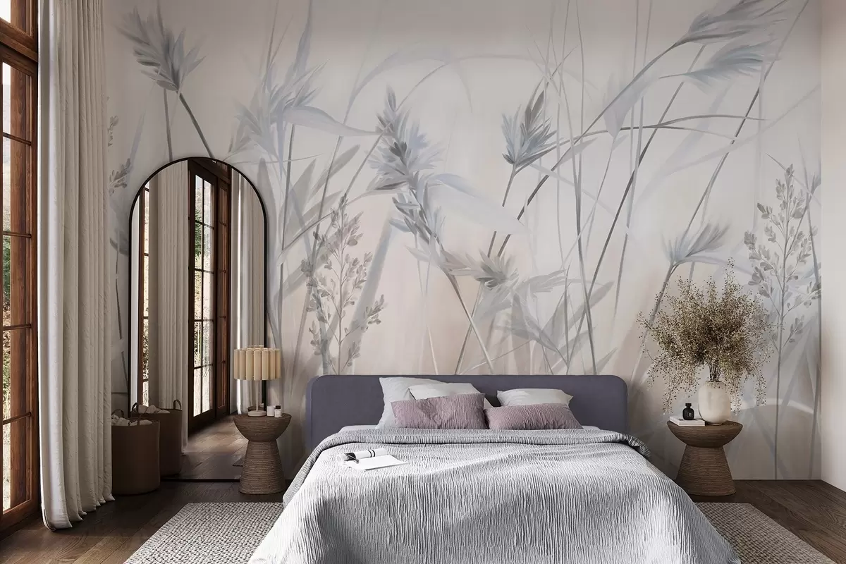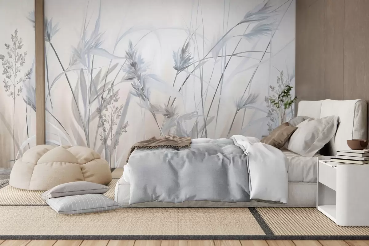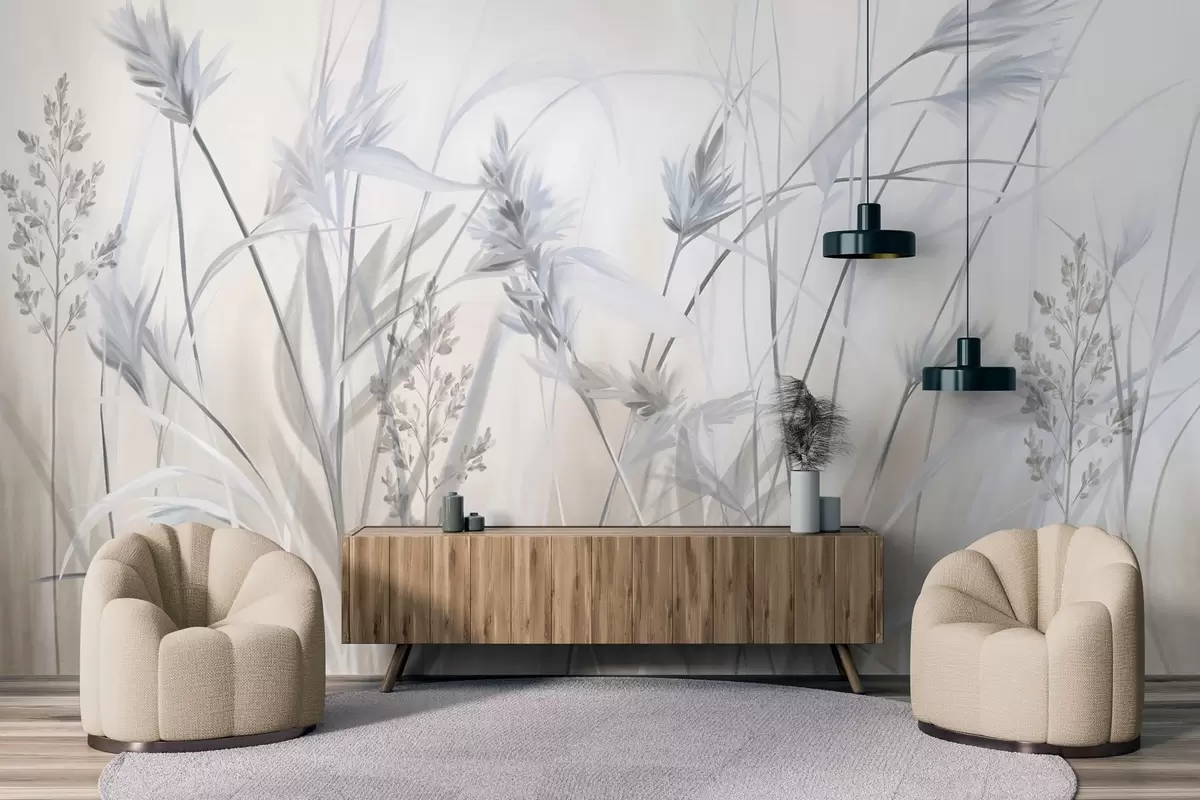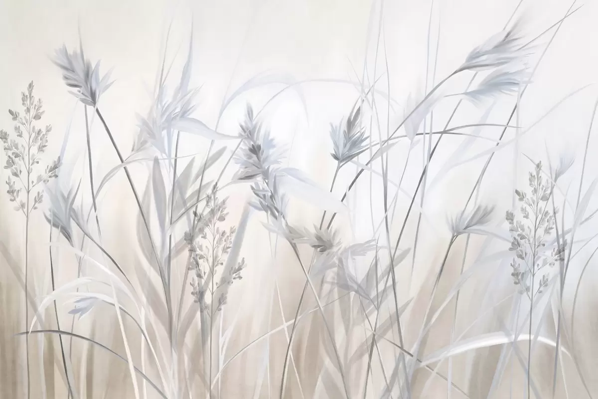 Fototapeter Høye, tørre gresshalm med fjærlignende topper i dempede farger, myk, disig hvit og beige bakgrunn Nr. w09652v1
