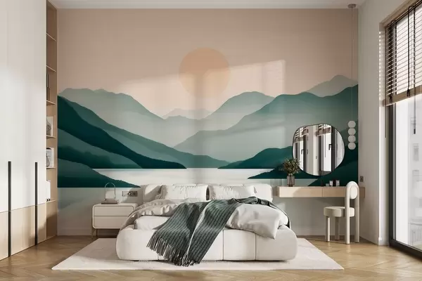 Fototapeter Stille fjellandskap med solen over innsjøen Nr. w09735