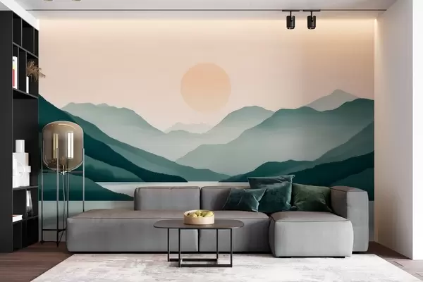 Fototapeter Stille fjellandskap med solen over innsjøen Nr. w09735