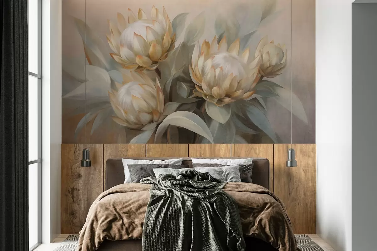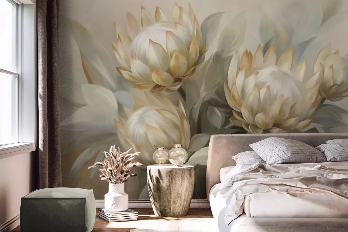 Fototapeter Teksturerte proteablomster med grønne blader og en myk, uskarp bakgrunn Nr. w09738