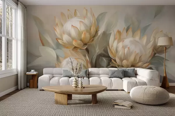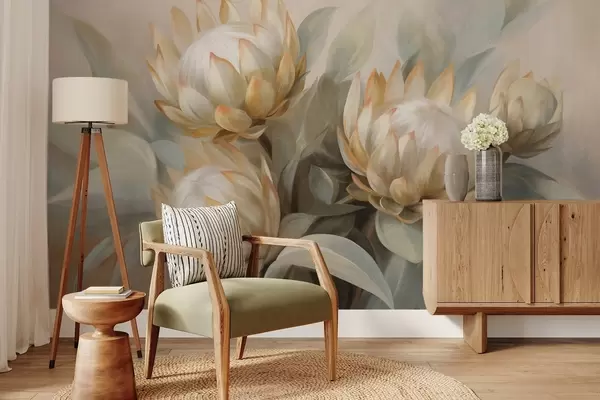 Fototapeter Teksturerte proteablomster med grønne blader og en myk, uskarp bakgrunn Nr. w09738