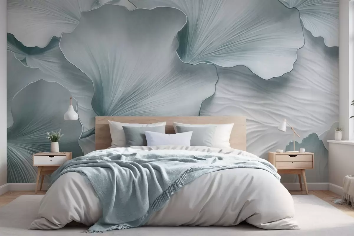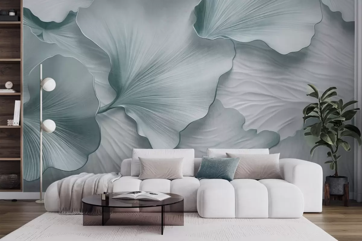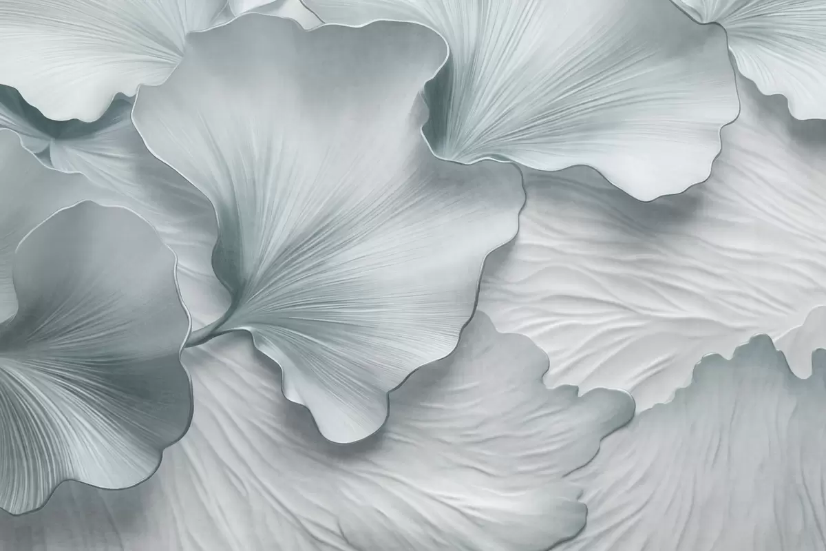 Fototapeter Teksturerte, blå og hvite ginkgoblader med delikat organisk trykk Nr. w09741v1