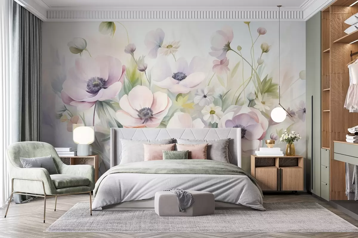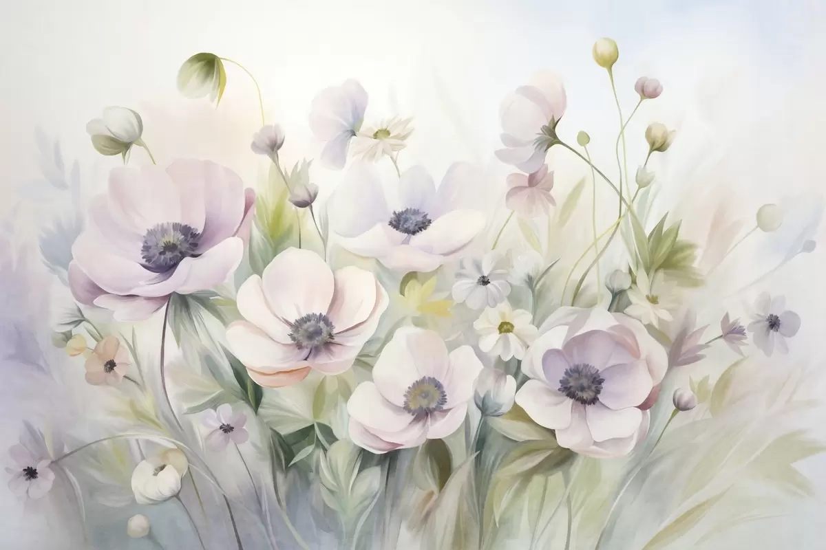 Fototapeter Et felt med pastellrosa og hvite anemoner, grønt løvverk og små hvite tusenfryd Nr. w09742