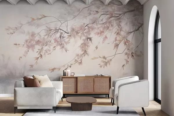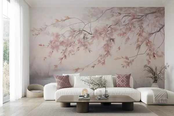 Fototapeter Teksturert landskap med kirsebærblomstgren, rosa blader, myk, tåkete bakgrunn Nr. w09743