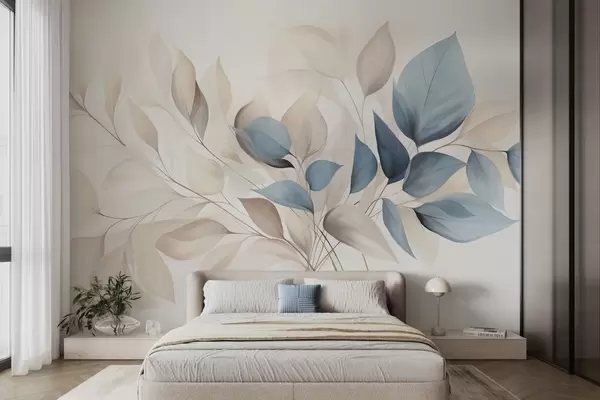 Fototapeter Abstrakte, gjennomsiktige blader i nyanser av blått, beige og kremfarget, strukturert kunst Nr. w09744