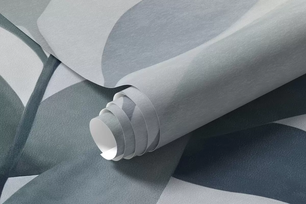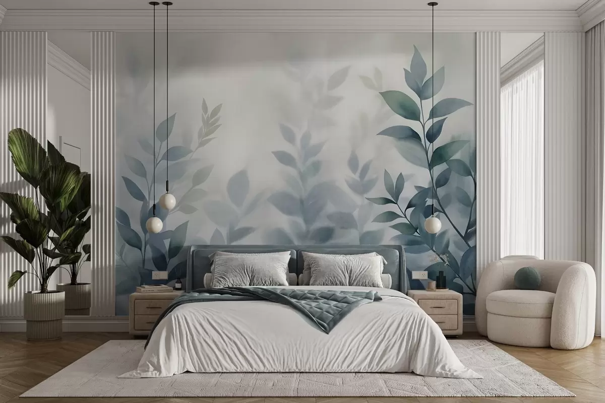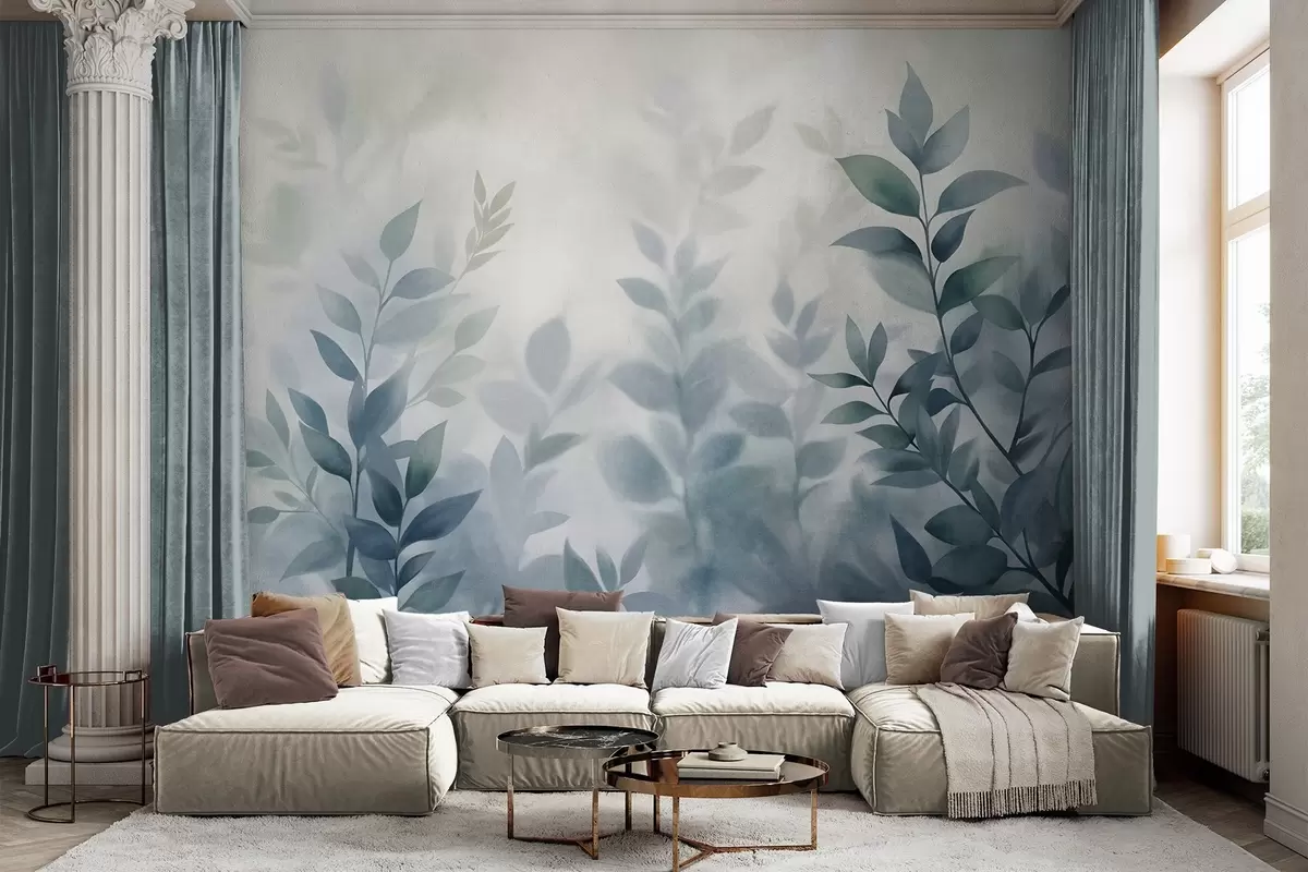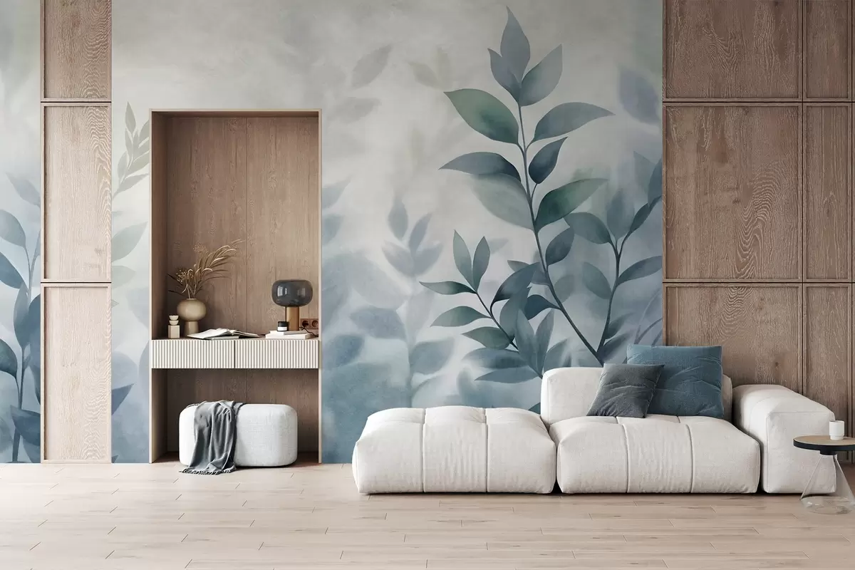 Fototapeter Delikate grener med dempede blå blader, akvarellmaleri-stil, strukturert kunst Nr. w09750v1