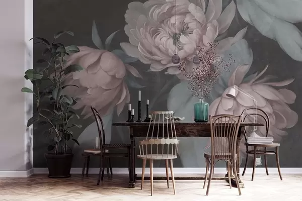 Fototapeter Teksturerte, lyserøde pionblomster med dempede grønne blader mot en mørk bakgrunn Nr. w09751v1