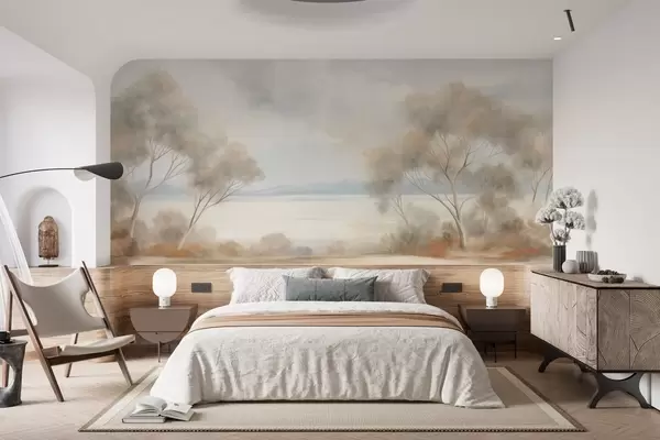 Fototapeter Et landskapsmaleri med struktur og trær under en overskyet himmel Nr. w09753