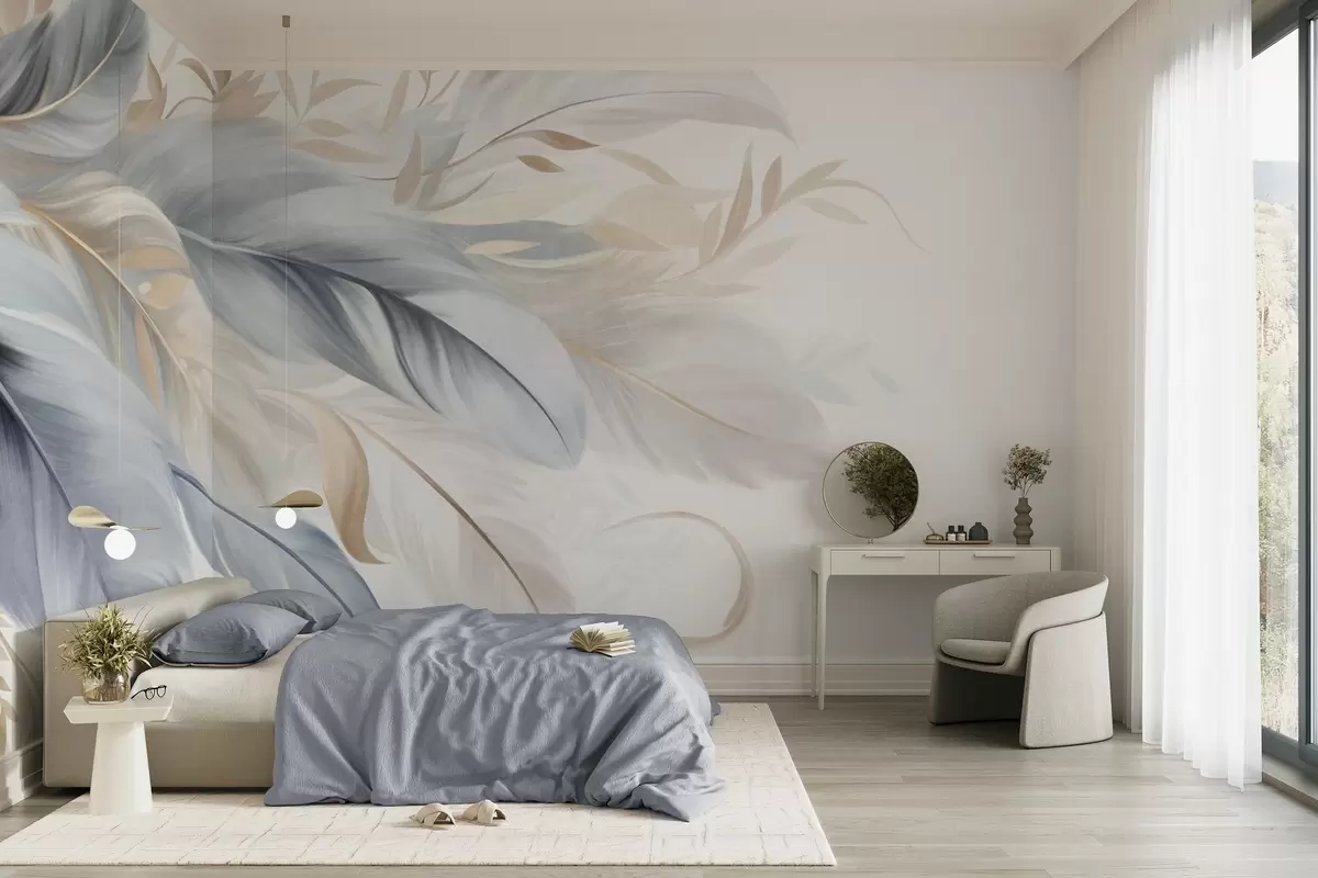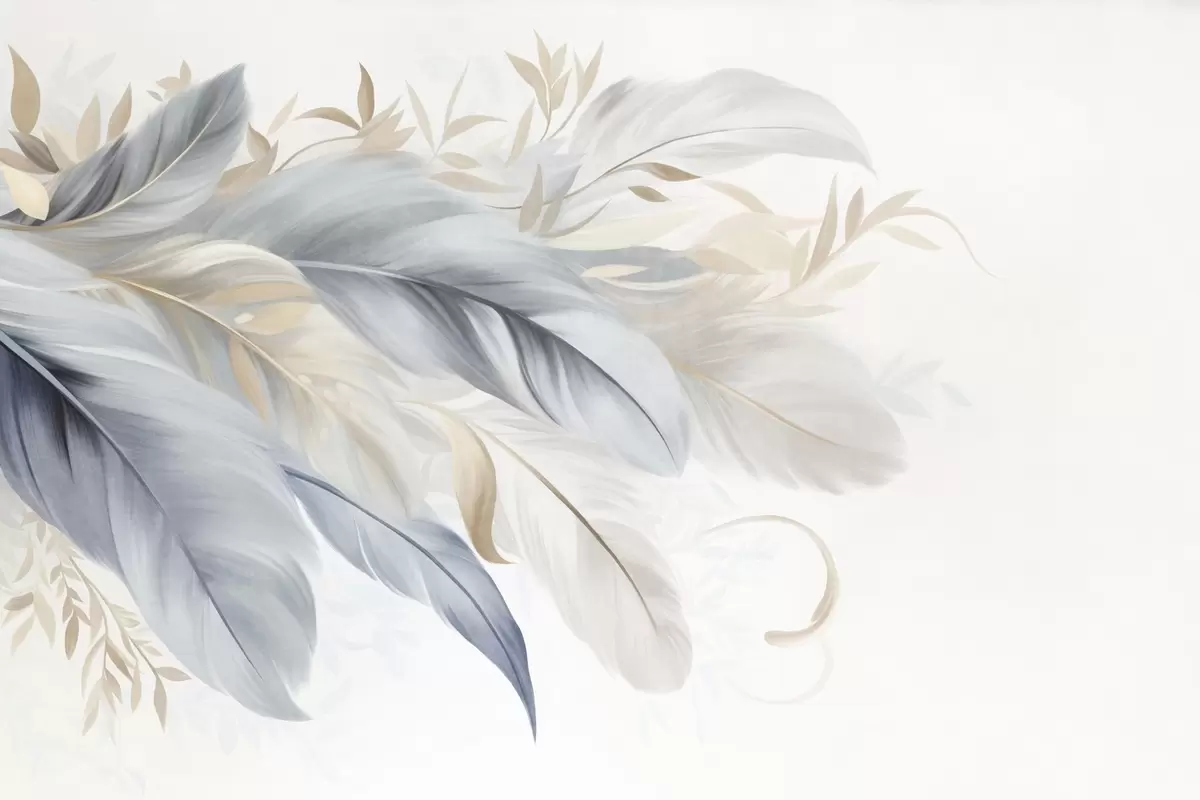 Fototapeter Fjær i pastellfarger med struktur og delikate blader mot en lys bakgrunn Nr. w09763