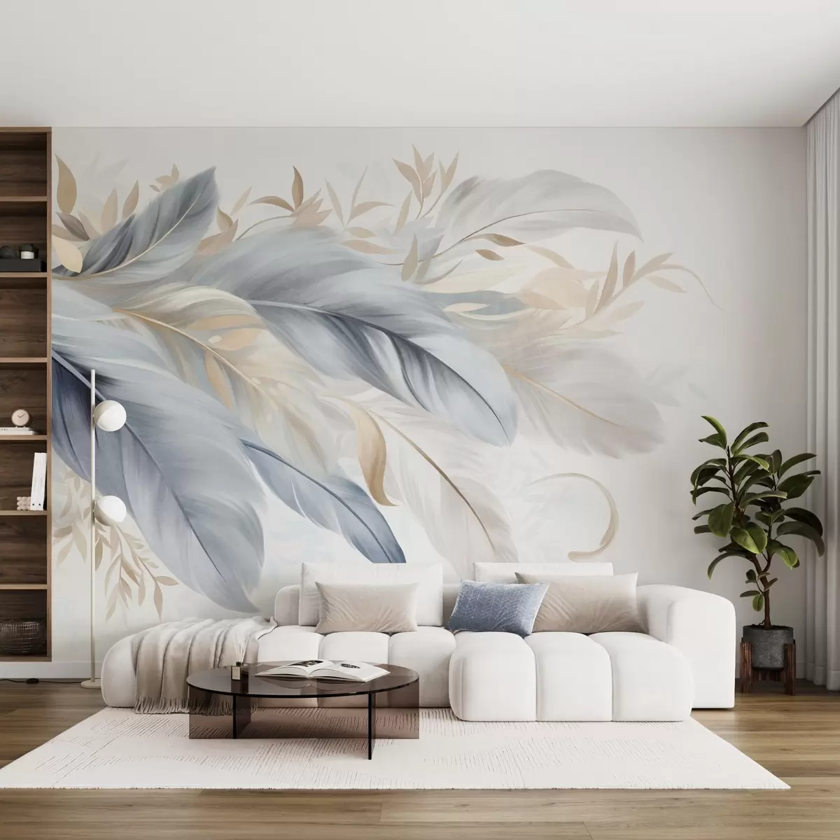 Fototapeter Fjær i pastellfarger med struktur og delikate blader mot en lys bakgrunn Nr. w09763