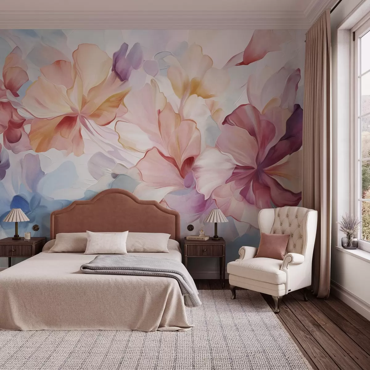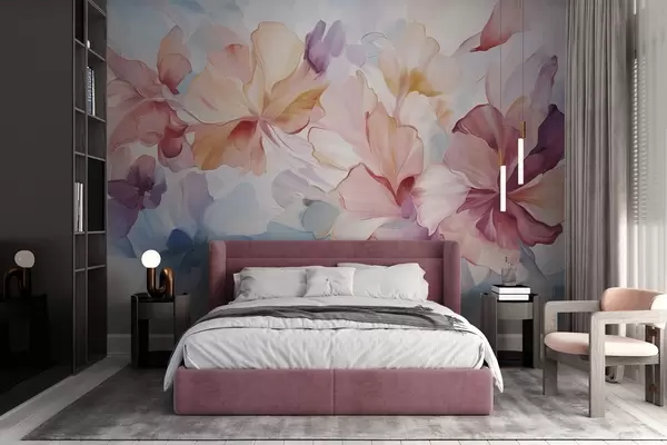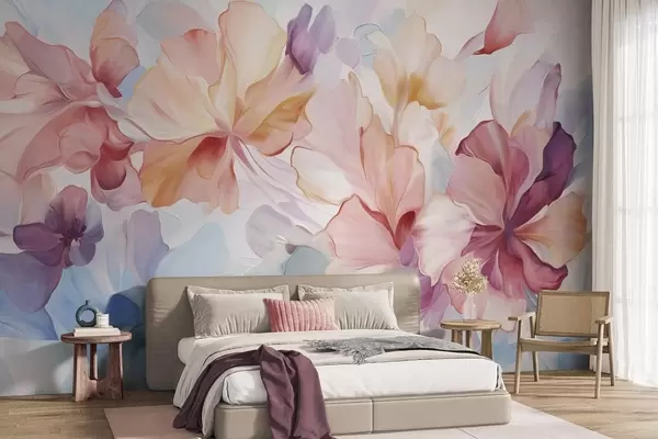 Fototapeter Abstrakte fantasiblomster i nyanser av rosa, fersken og lavendel, i malerisk stil med strukturert uttrykk Nr. w09767