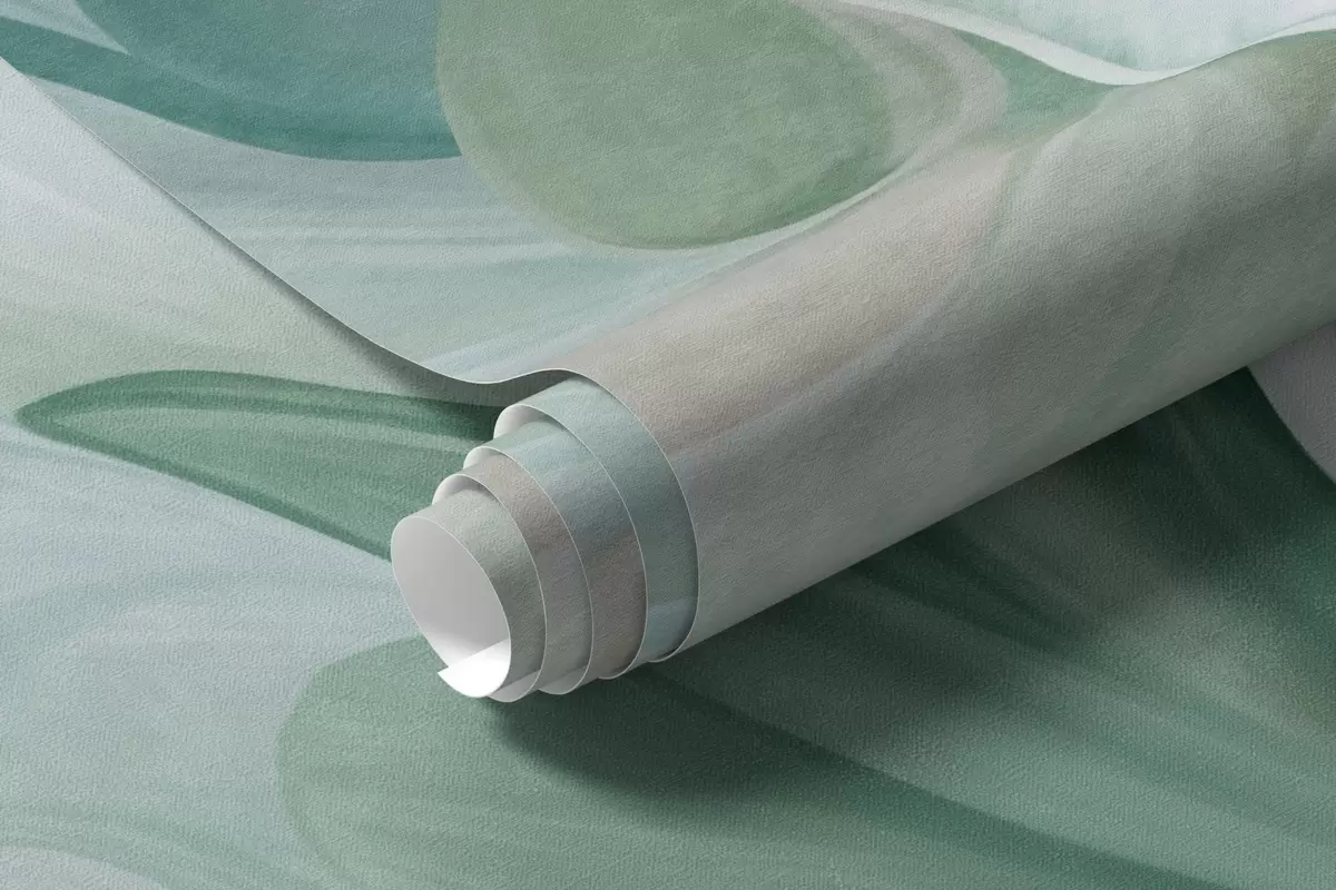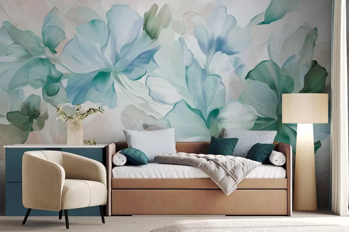 Fototapeter Abstrakte fantasiblomster i nyanser av grønt, blått og beige i malerisk stil, teksturert kunst Nr. w09767v1