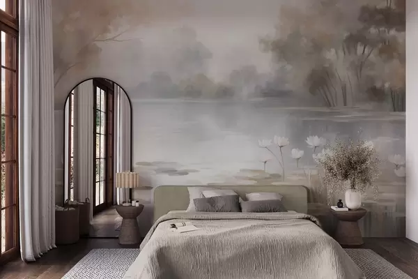 Fototapeter Et landskap med variert topografi, en innsjø med hvite vannliljer, omgitt av trær i dempede farger Nr. w09768