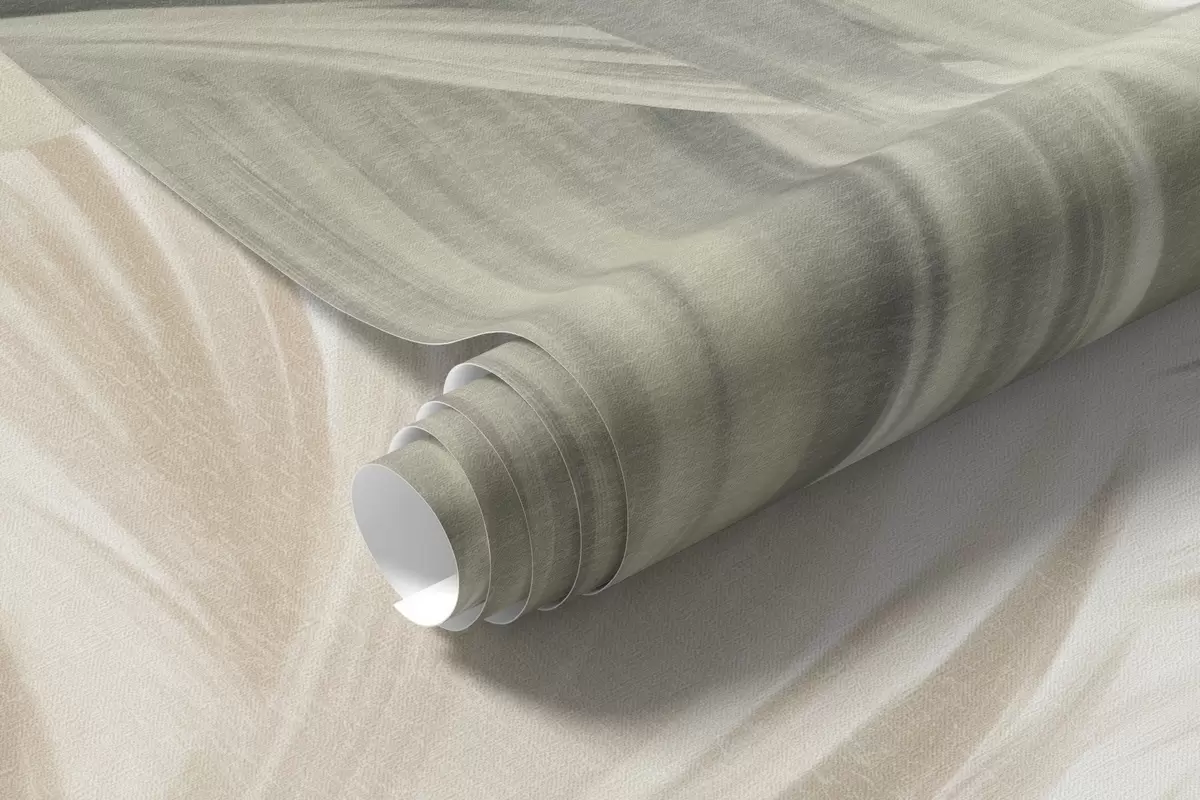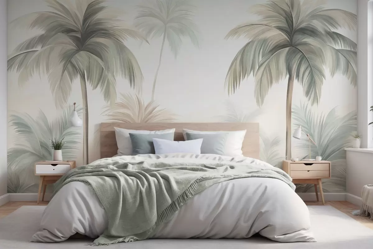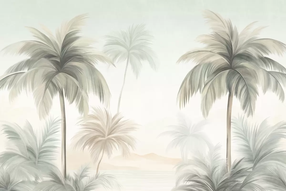 Fototapeter Palmer med strukturert bark og bladverk i dempede grønn- og beigefarger mot en mild himmel Nr. w09770