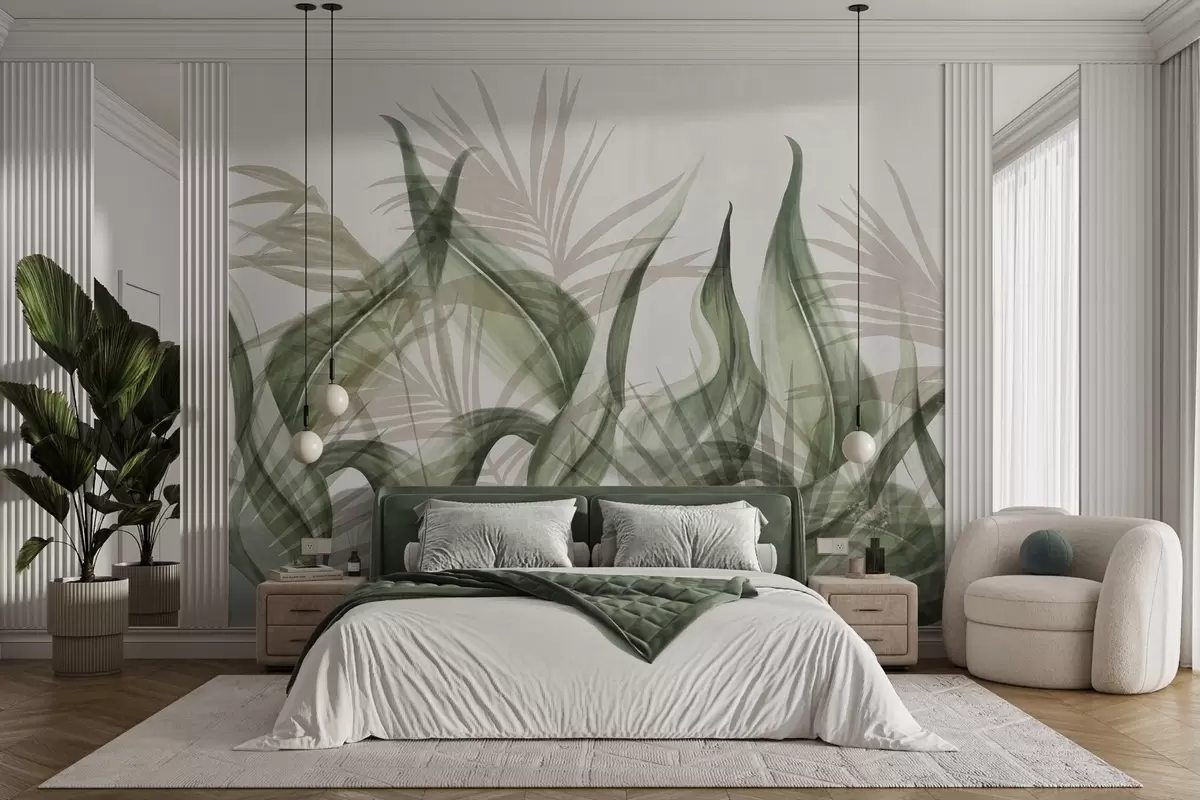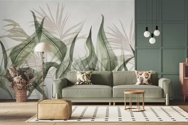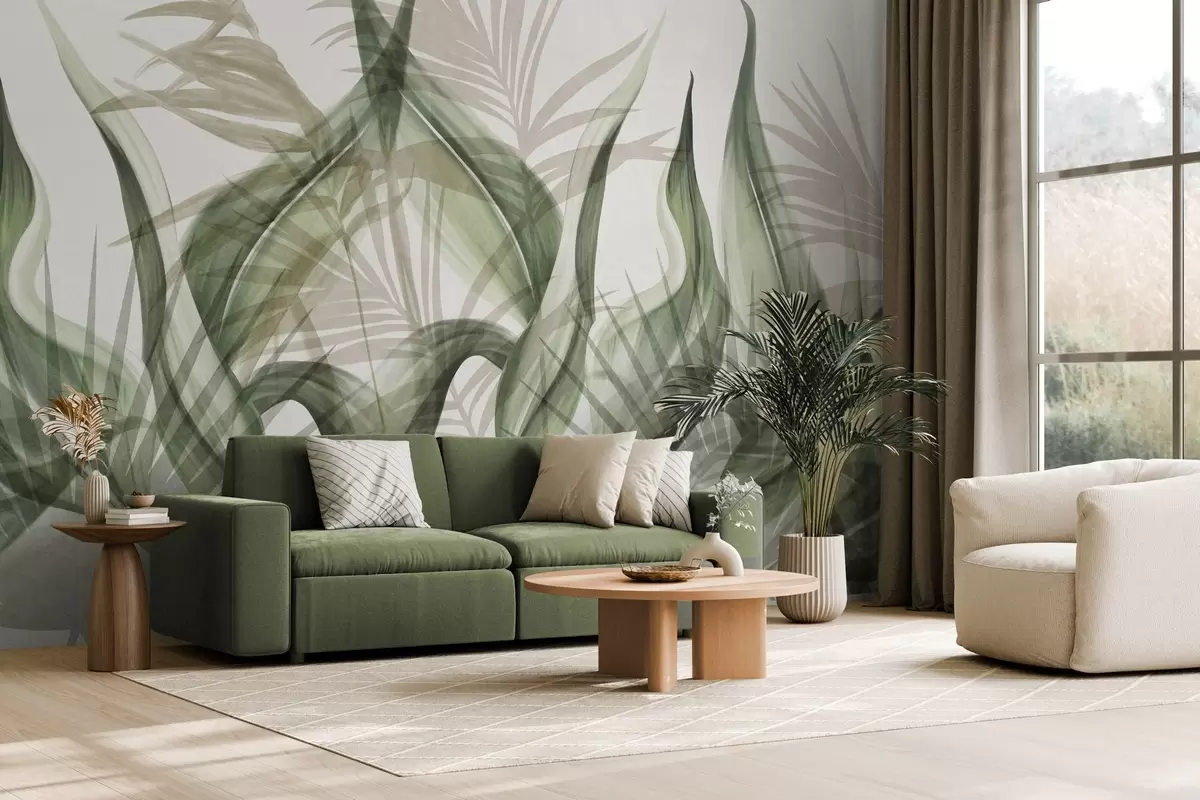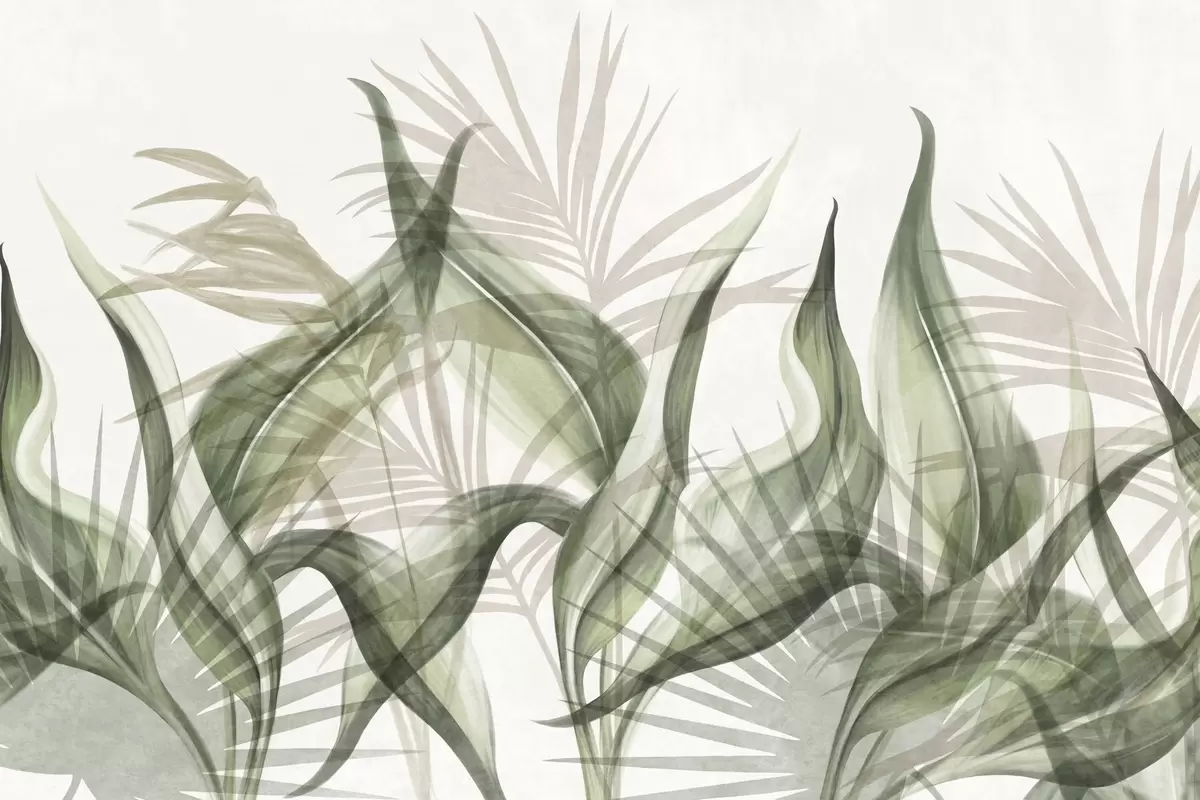 Fototapeter Tropiske blader i beige og grønne nyanser mot en hvit bakgrunn, strukturert akvarellstil Nr. w09772v1
