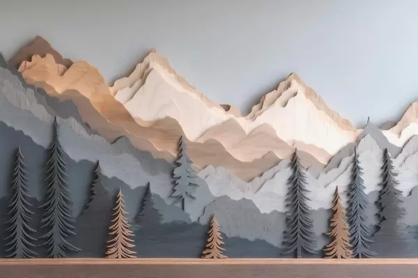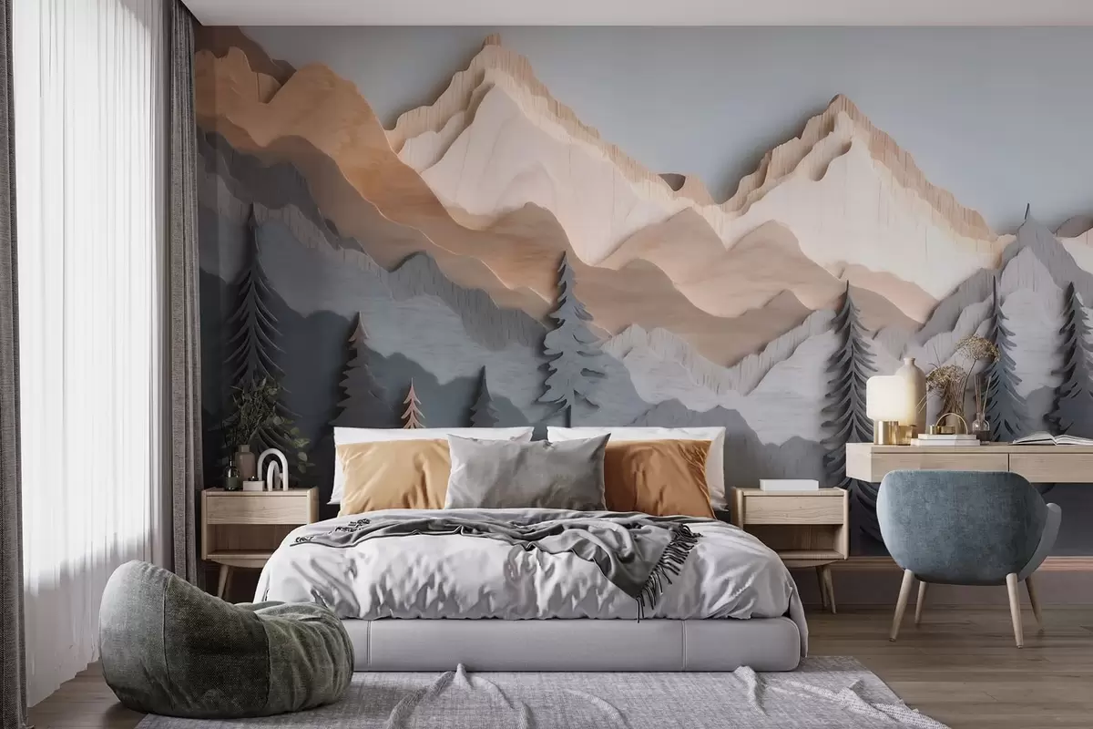 Fototapeter Naturlandskap med furutrær og fjell i utskåret tre-stil Nr. w09793