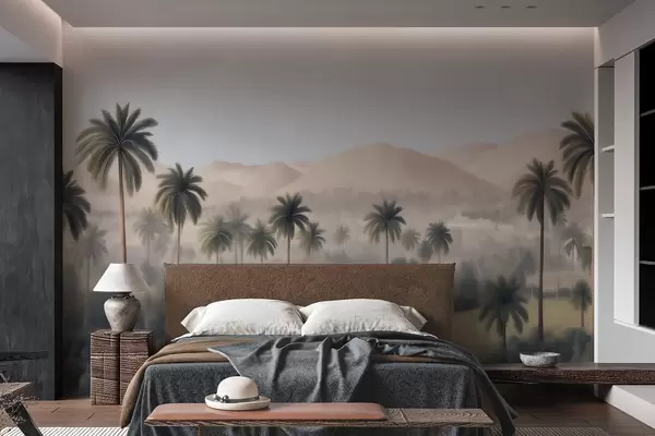 Fototapeter Tropisk landskap med palmer og fjell, et vintage-panorama i beige og grønne nyanser Nr. w09798