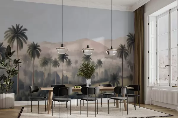 Fototapeter Tropisk landskap med palmer og fjell, et vintage-panorama i beige og grønne nyanser Nr. w09798