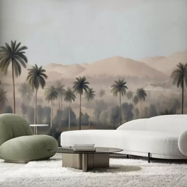 Fototapeter Tropisk landskap med palmer og fjell, et vintage-panorama i beige og grønne nyanser Nr. w09798