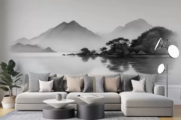Fototapeter Svart-hvitt landskap med fjell og innsjø i en lett tåke Nr. w09803