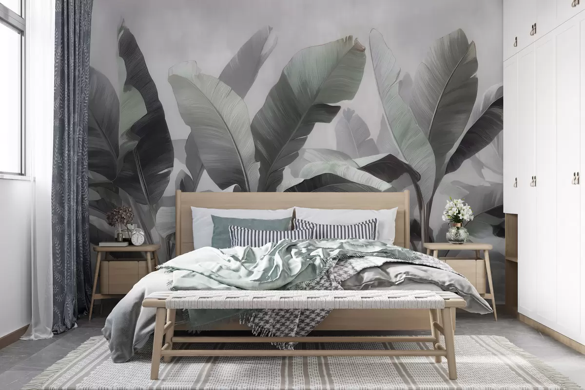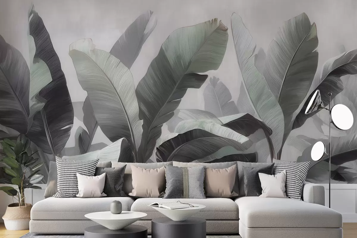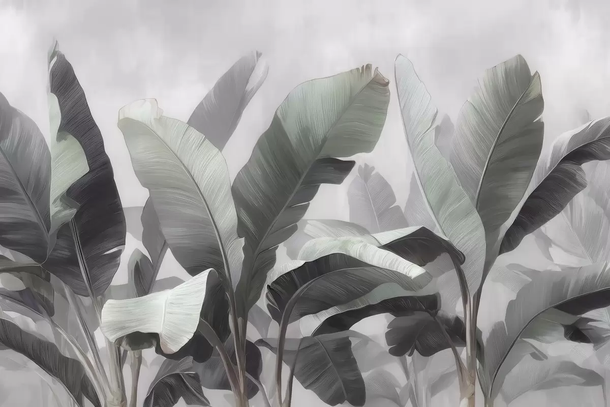 Fototapeter Abstrakte, store bananblader i en nøytral fargepalett med myke grågrønne nyanser Nr. w09805