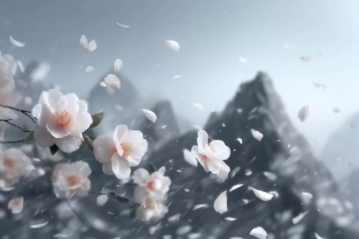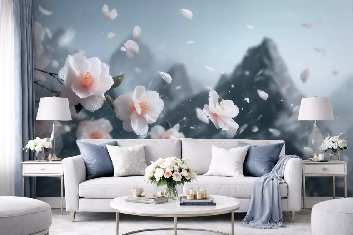 Fototapeter Delikate kirsebærblomster mot en fjellbakgrunn, stemningsfullt japansk landskap i pastellfarger Nr. w09808
