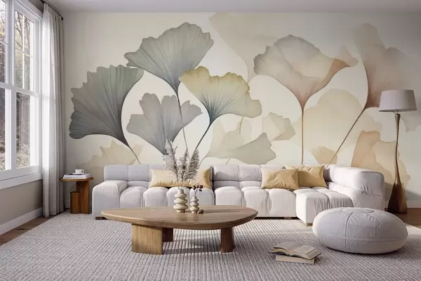 Fototapeter Abstrakte ginkgoblader i dempede pastellfarger som blått, grønt og ferskenfarget, strukturert kunst Nr. w09810
