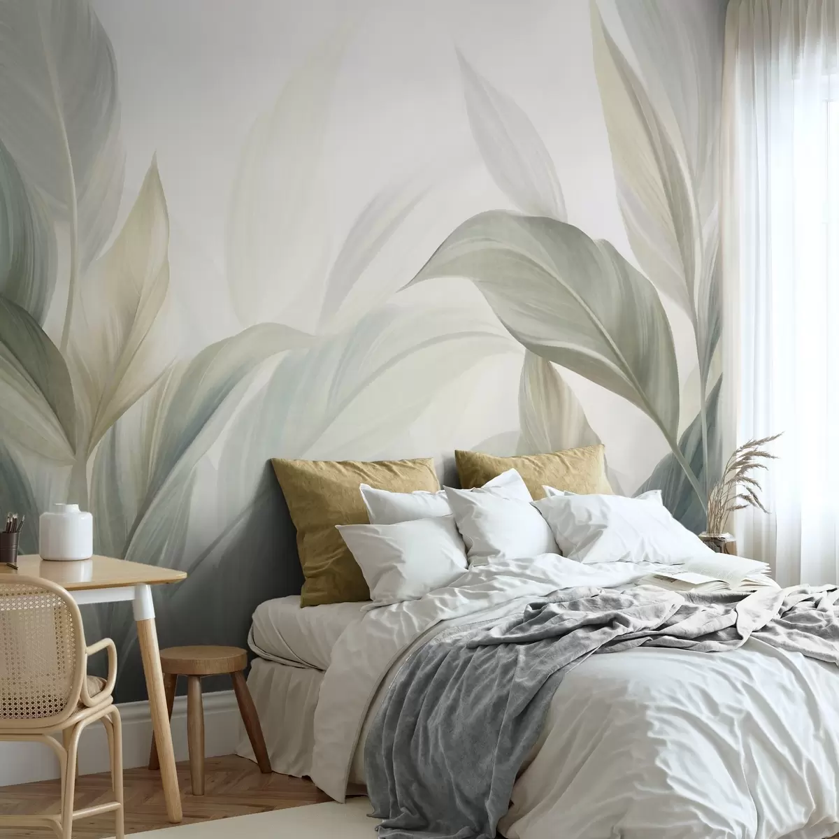 Fototapeter Store, lysegrønne tropiske blader med myke pastellfarger og strukturert kunst Nr. w09816