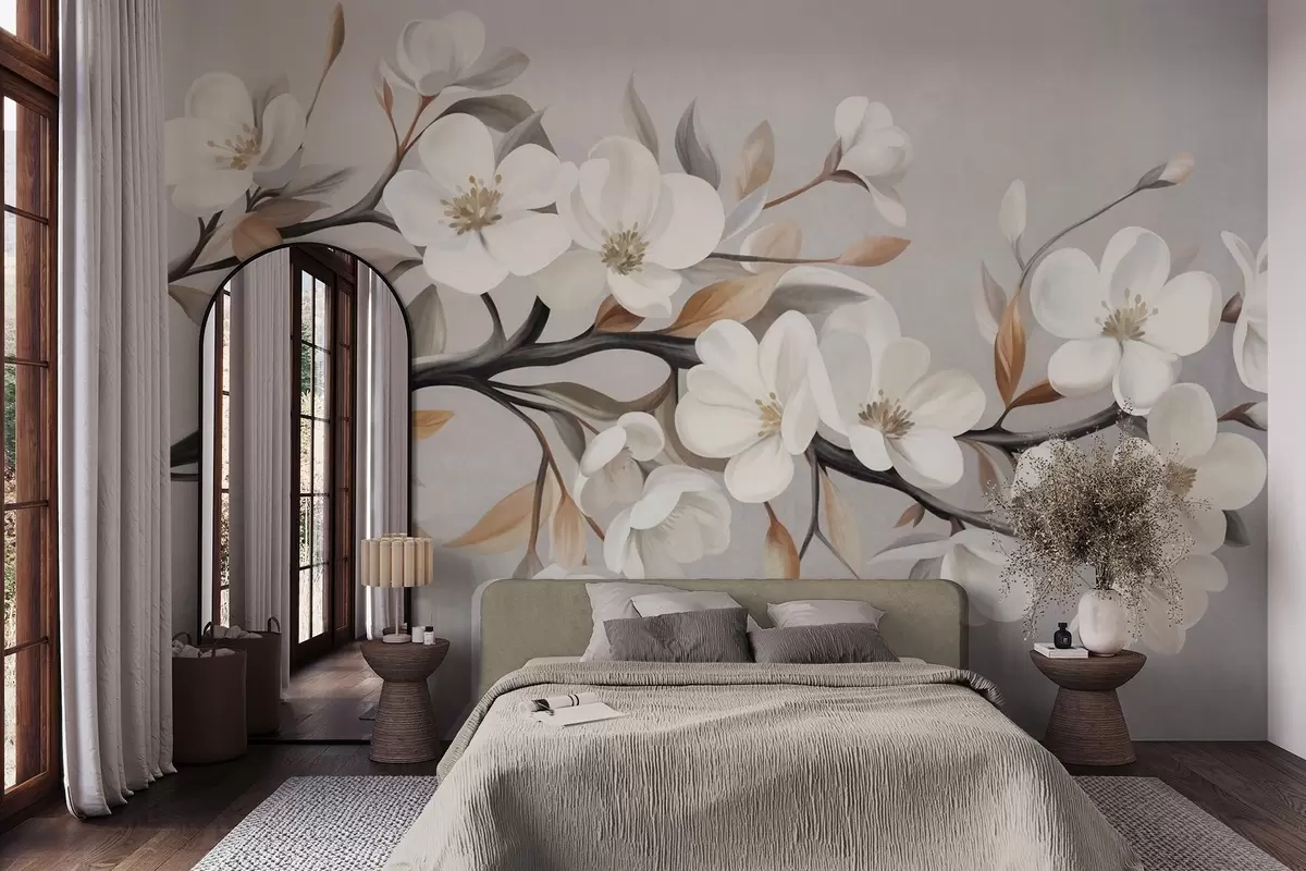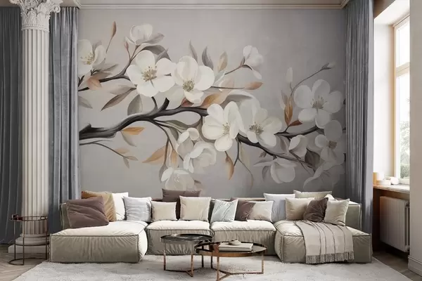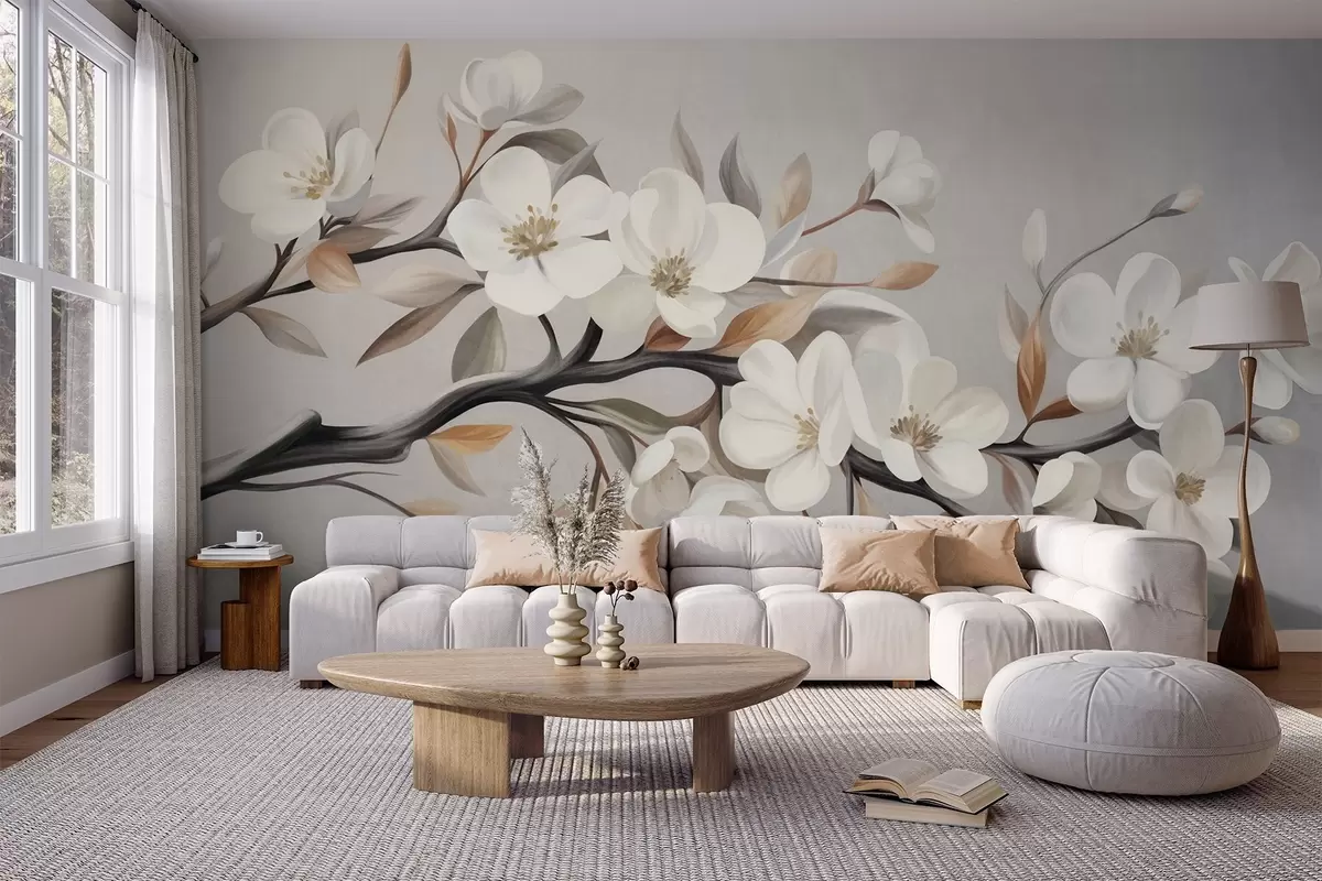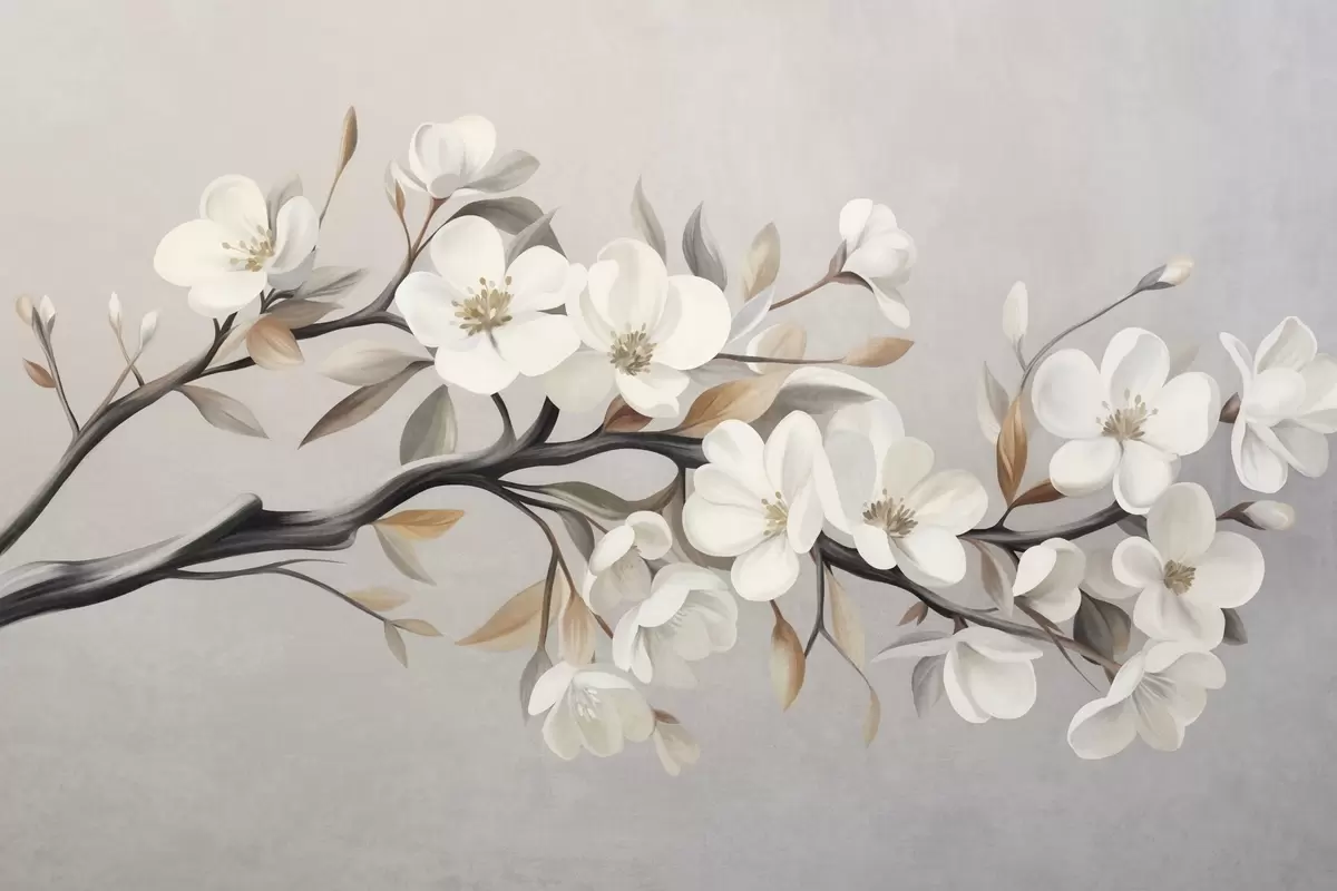 Fototapeter En gren med struktur, hvite blomster og brune blader mot en lysegrå bakgrunn Nr. w09817