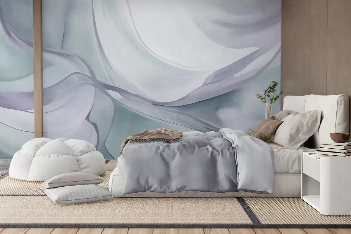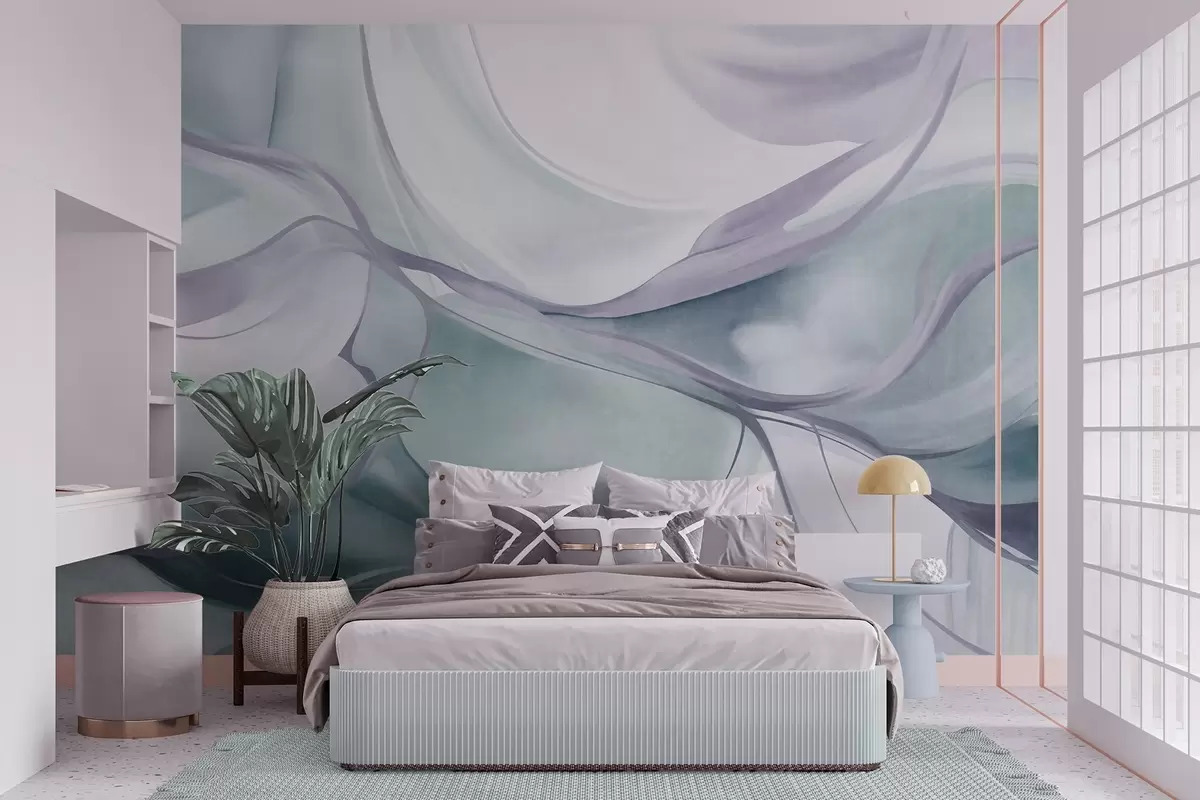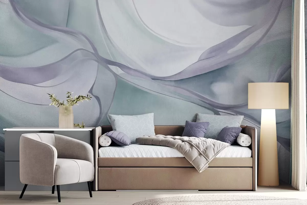 Fototapeter Abstrakte, strukturerte, flytende former i blå og grå nyanser med delikate linjer Nr. w09818v1