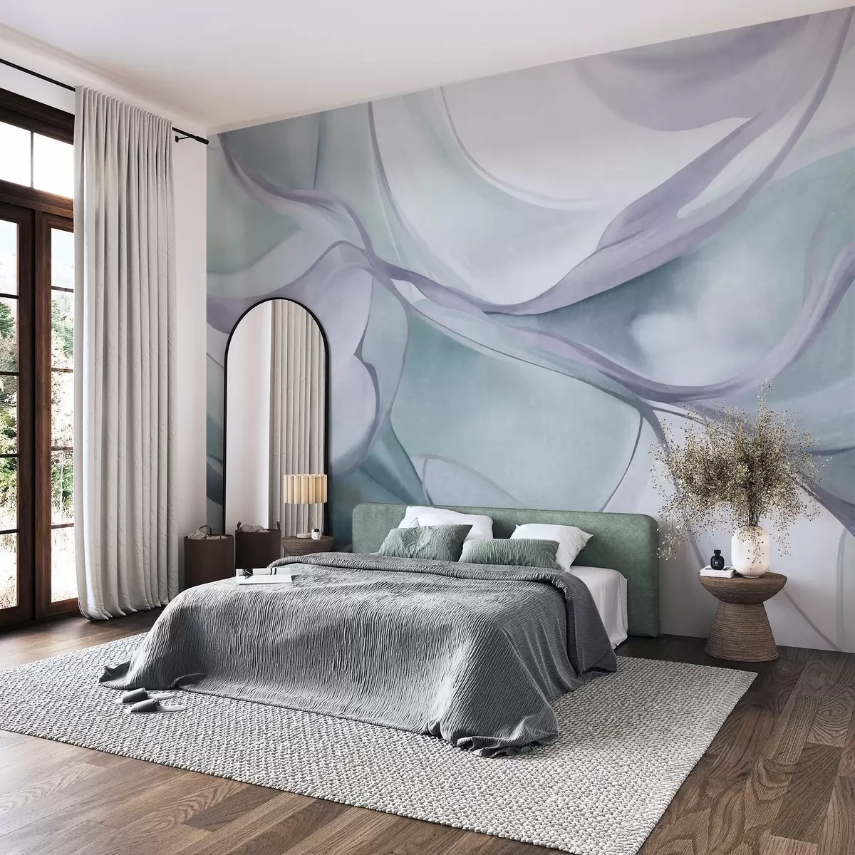 Fototapeter Abstrakte, strukturerte, flytende former i blå og grå nyanser med delikate linjer Nr. w09818v1