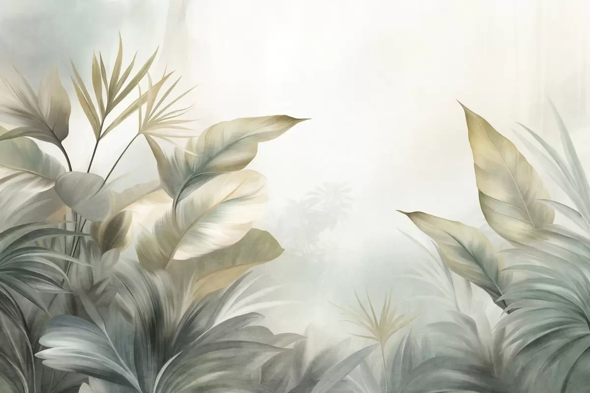 Fototapeter Store, strukturerte tropiske blader i dempede grønne og beige nyanser, et jungelmiljø Nr. w09820