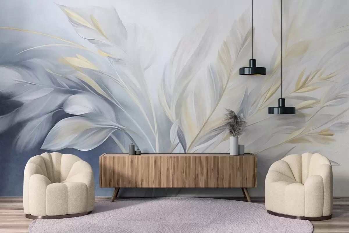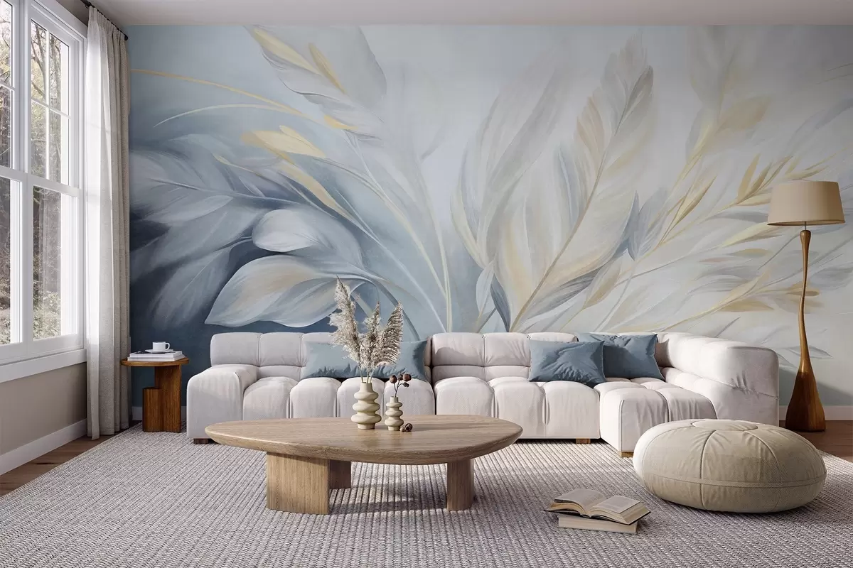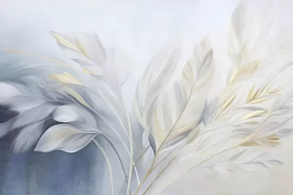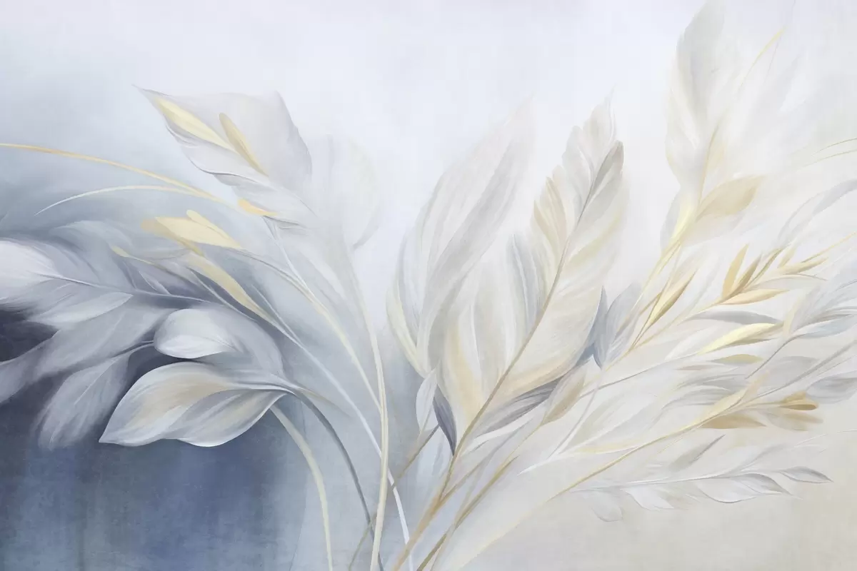 Fototapeter Fjær med struktur og gule detaljer, mot en myk bakgrunn i lyseblått og hvitt Nr. w09826