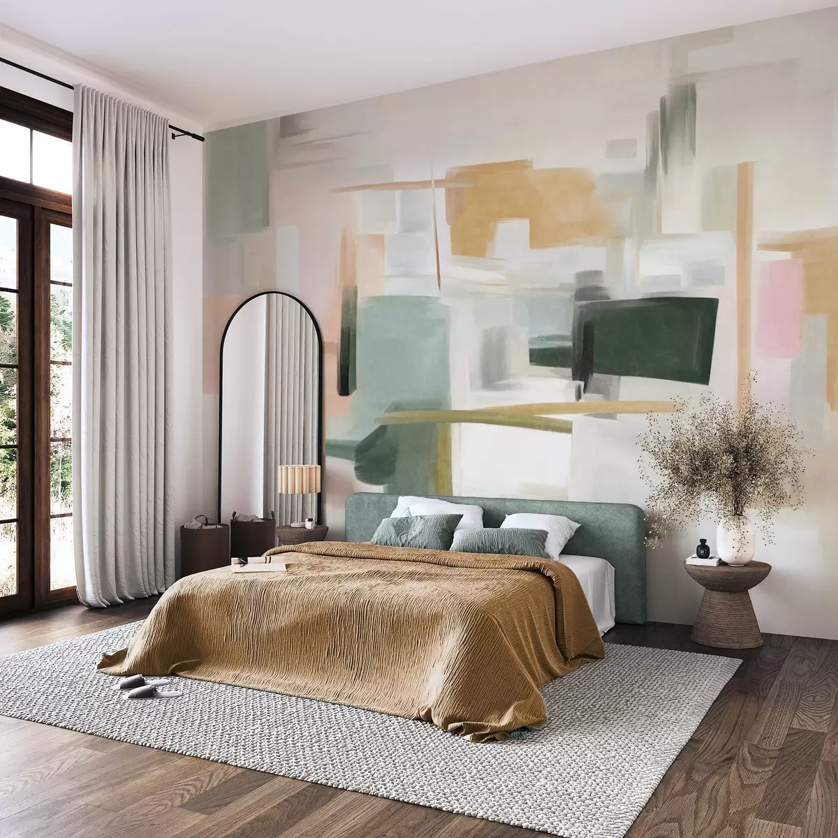 Fototapeter En abstrakt, minimalistisk malestil med myke pastellfarger, geometriske former og linjer Nr. w09828